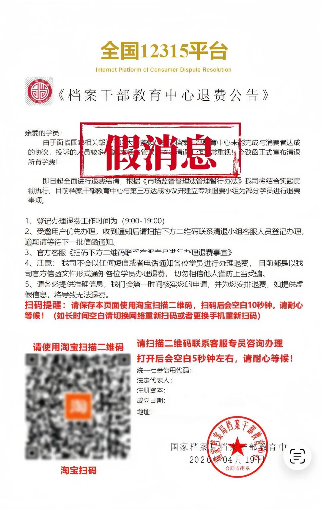 1. 国家档案局档案干部教育中心从未发布任何形式的“退费公告”,亦未授权任何第三方机构或个人以国家档案局档案干部教育中心名义开展所谓的退费工作。