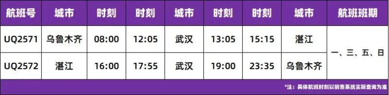 乌鲁木齐—武汉—湛江航线复航后的班期为每周一、三、五、日。去程UQ2571航班8时从乌鲁木齐天山国际机场起飞,12时05分抵达武汉天河国际机场;13时05分从武汉天河国际机场起飞,15时15分抵达湛江吴川国际机场。返程UQ2572航班16时从湛江吴川国际机场起飞,17时55分抵达武汉天河国际机场,19时从武汉天河国际机场起飞,23时35分抵达乌鲁木齐天山国际机场。