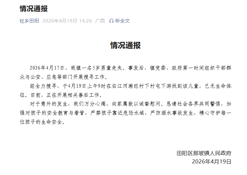 经全力搜寻,于4月19日上午9时在右江河濑旺村下村屯下游找到该儿童,已无生命体征。目前,正在开展相关善后工作。