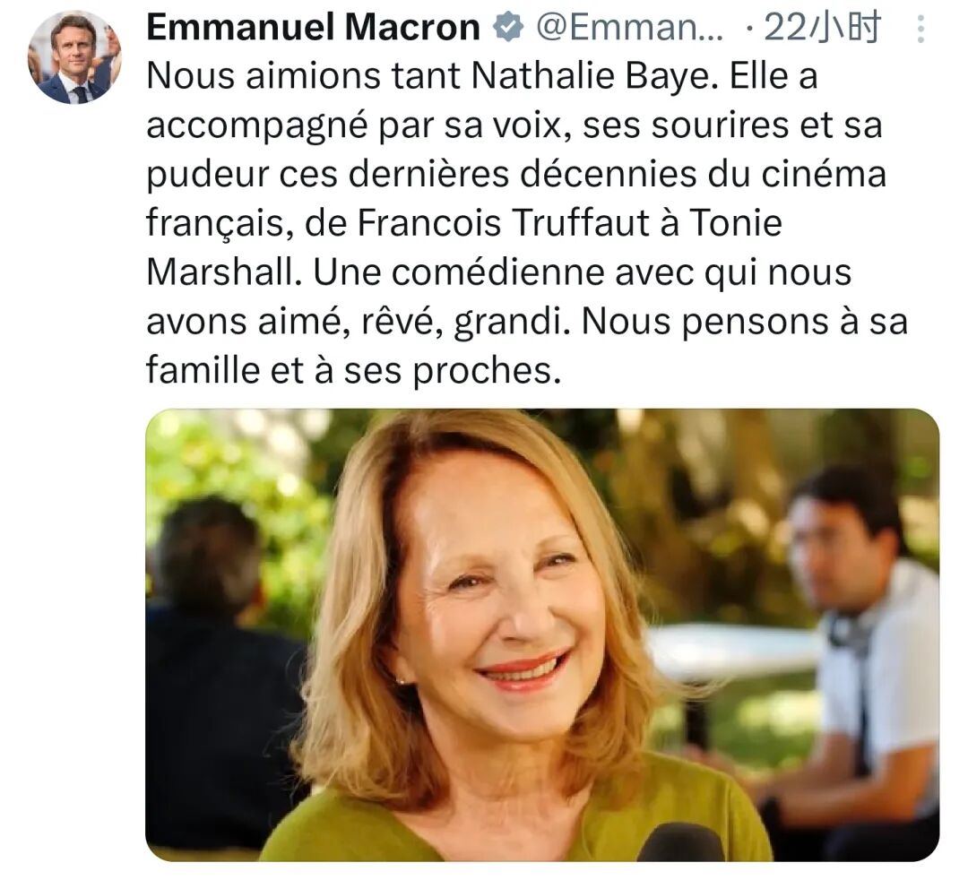 4月18日,法国总统马克龙发文悼念纳塔莉·贝伊,称她是法国电影史上不可或缺的存在,“是一位陪伴我们成长、做梦与热爱的演员”。