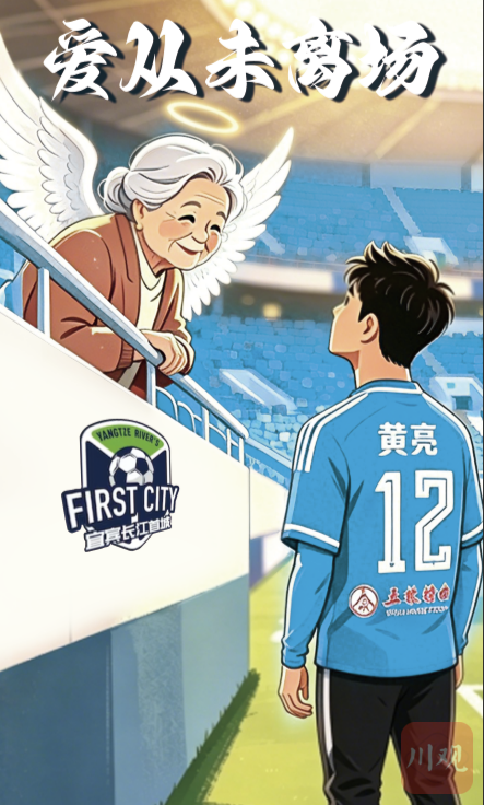 门旗上,宜宾队12号球员黄亮站在看台前方,望向已前往天堂的奶奶,门旗顶部赫然写着:爱从未离场。
