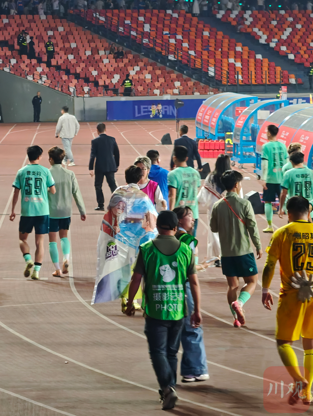 4月18日客战乐山,曹钰科和朋友们带着这面旗远征。当终场哨响,球员们来到看台前谢场时,他们高高展开门旗。那一刻,黄亮再也忍不住情绪,当场抱头痛哭,朝着球迷的方向深深鞠躬。