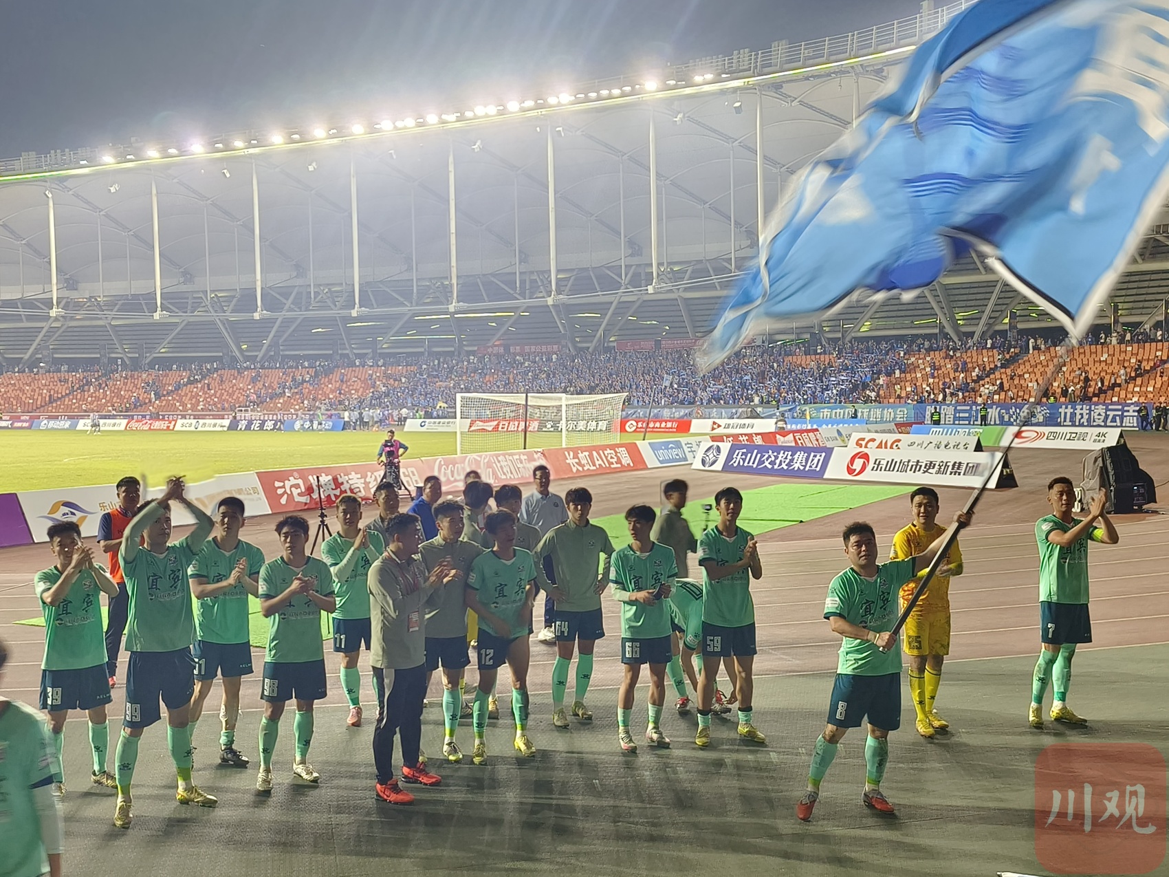 4月18日,随着主裁一声哨响,2025/2026四川省城市足球联赛决赛阶段第六轮较量中,宜宾队与乐山队2∶2握手言和。赛后的客场球迷区歌声绕梁,一面特殊的蓝色门旗在风中飘扬,吸引了所有人的目光。