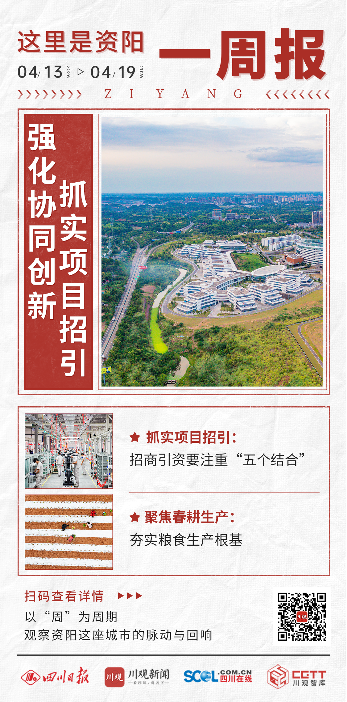 本周(4月13日至4月19日)是2026年第十六周,资阳一方面聚焦产业赛道运行与招商引资工作,多场重要会见传递出培育新质生产力的强烈信号;另一方面,广袤田野春耕正酣,科技赋能与规模化种植合力奏响乡村振兴“奋进曲”。