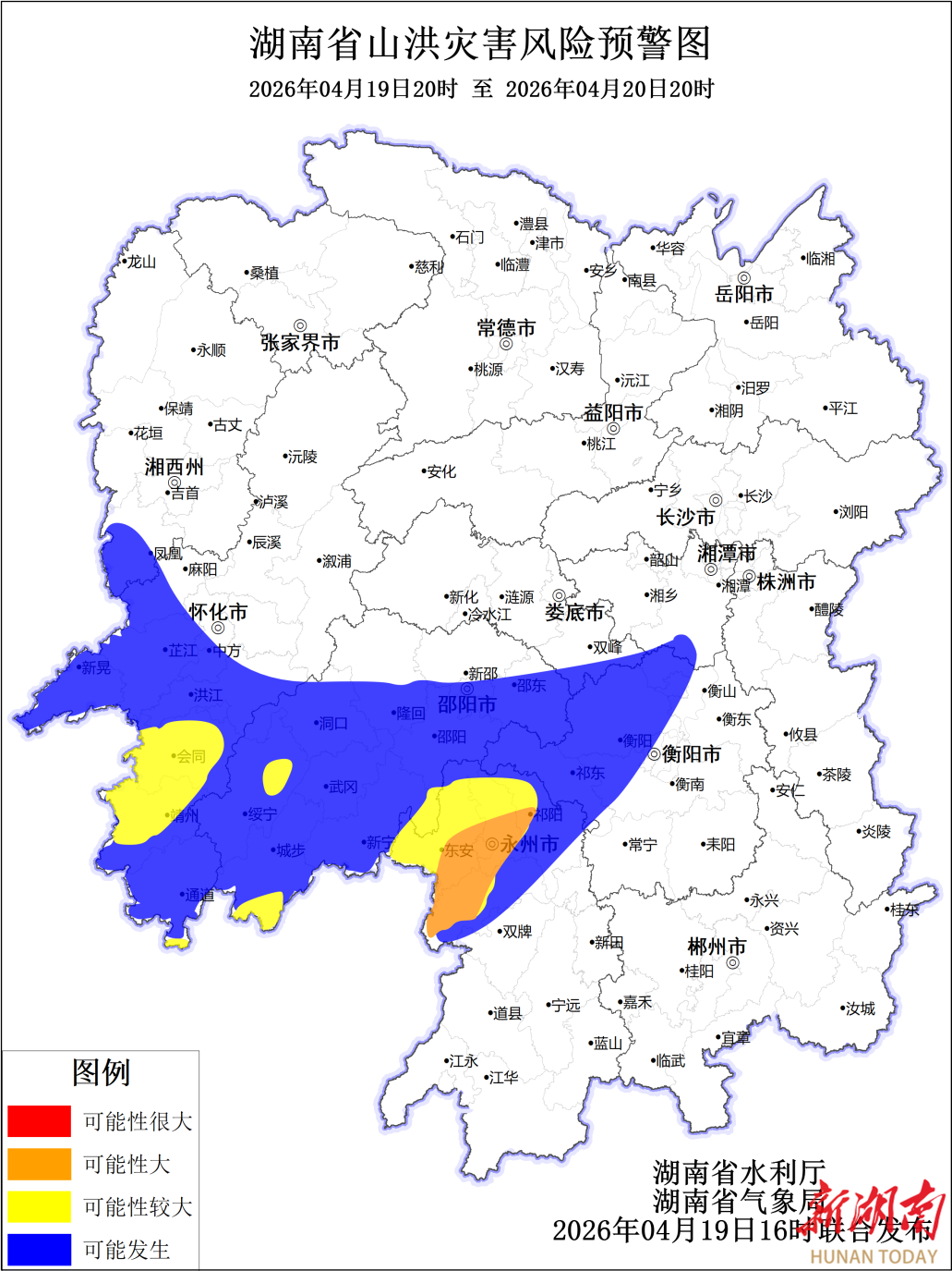 根据省气象局4月19日预报,省水利厅与省气象局联合会商得出结论:受降雨影响,19日20时至20日20时,永州市、湘潭市、衡阳市、邵阳市、怀化市、娄底市、湘西土家族苗族自治州等局地可能发生山洪灾害。省水利厅与省气象局联合发布山洪灾害风险预警。