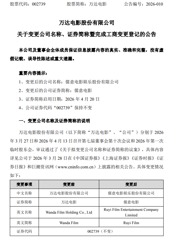 19日,万达电影股份有限公司发布关于变更公司名称、证券简称暨完成工商变更登记的公告称:万达电影股份有限公司变更公司名称为儒意电影娱乐股份有限公司。