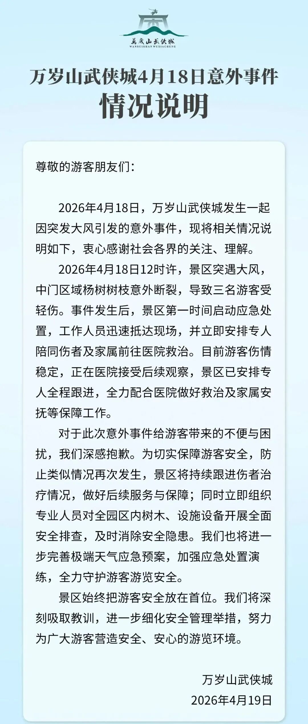 近日,开封万岁山景区树枝掉落,视频显示有游客被砸中倒地。19日下午,开封市万岁山游览区有限公司官方微信公众号“万岁山武侠城”就此事发布情况说明。