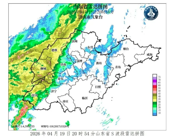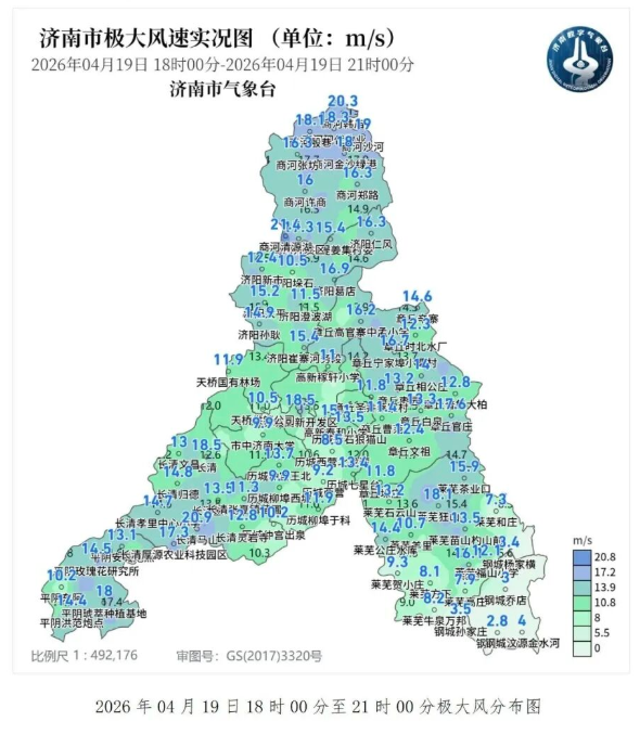 2026年4月19日18时至2026年4月19日21 时,全市216个测站中有31个极大风力达到8级,其中商河清源湖站和长清马山站极大风力达到9级,极大风速分别为 21.4m/s 和 20.9m/s。