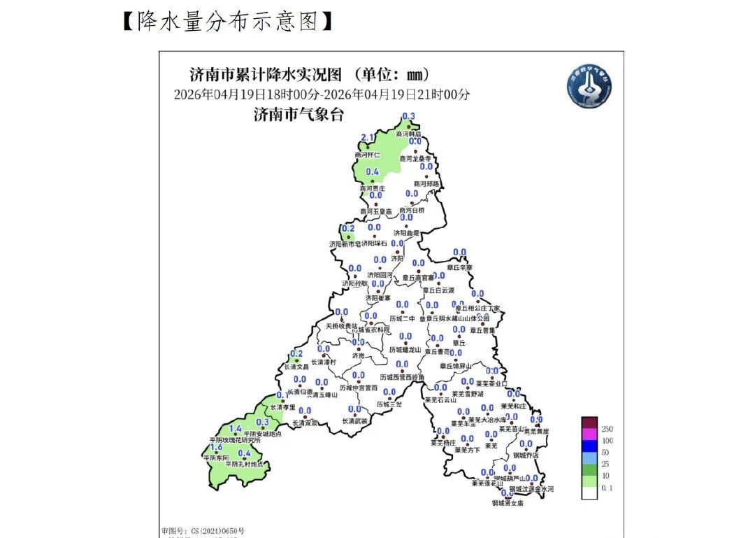 济南市气象台4月19日21时发布天气预报,根据气象观测站网统计,2026年4月19日18时至 2026年4月19日21 时降水量(毫米):全市平均0.1(商河县商河怀仁最大2.1),折合水量约0.0 亿立方,市区0.0历城区0.0长清区 0.0平阴县0.7济阳区 0.0商河县0.3 章丘区 0.0莱芜区 0.0钢城区 0.0 高新区 0.0南山区 0.0起步区0.0。