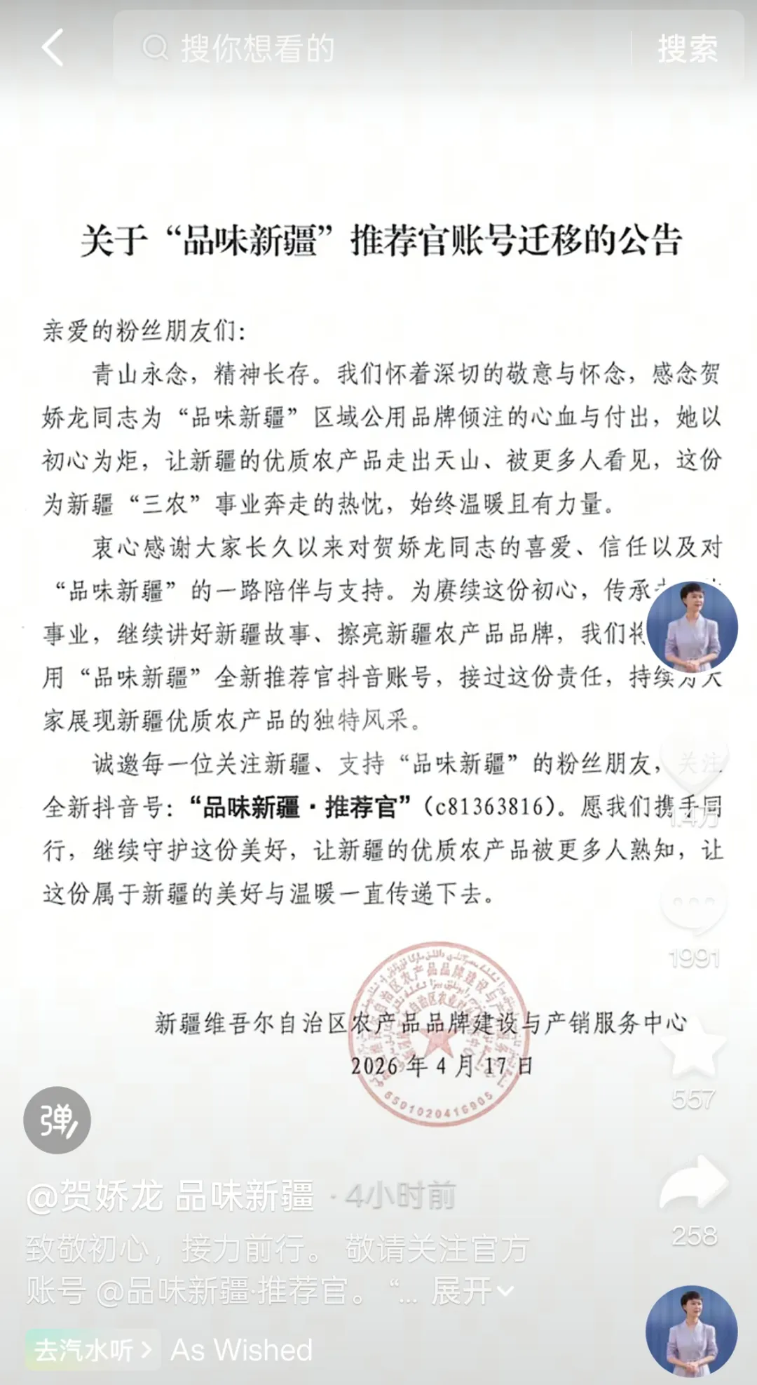 4月19日,贺娇龙的个人账号时隔100天再次更新,新疆维吾尔自治区农产品品牌建设与产销服务中心发布《关于“品味新疆”推荐官账号迁移的公告》,对贺娇龙账号及新开通账号的情况予以说明。