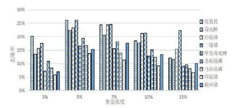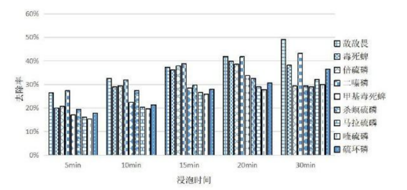 此外,国内也有不少学者研究了碳酸氢钠对农药的去除效果,比如山西省夏县综合检验检测中心的研究者找来了更多种农药,选择了9种有机磷农药。清洗方式包括用清水、食盐水(浓度包括3%、5%、7%、10%、15%)、小苏打水(浓度也为3%、5%、7%、10%、15%)、淘米水清洗。