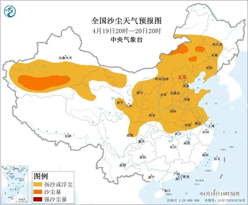■ 中央气象台19日18时发布沙尘暴蓝色预警:受冷空气大风影响,预计19日20时至20日20时,新疆东部和南部、青海西北部和东部、内蒙古中东部、甘肃中东部、宁夏、陕西、山西、北京、天津、河北、山东、河南、吉林中西部、辽宁、安徽中北部、江苏中北部、湖北北部、四川盆地北部等地的部分地区有扬沙或浮尘天气,其中,内蒙古中东部、新疆南部等地的部分地区有沙尘暴。