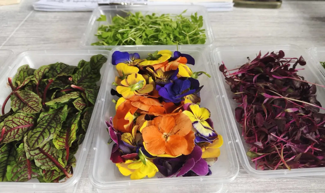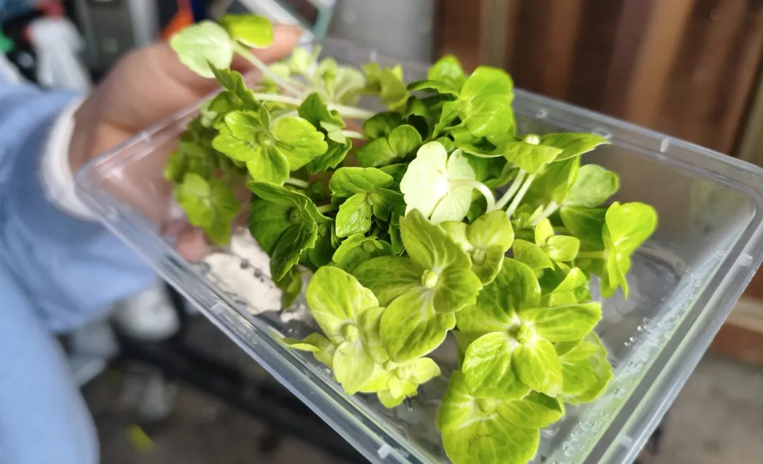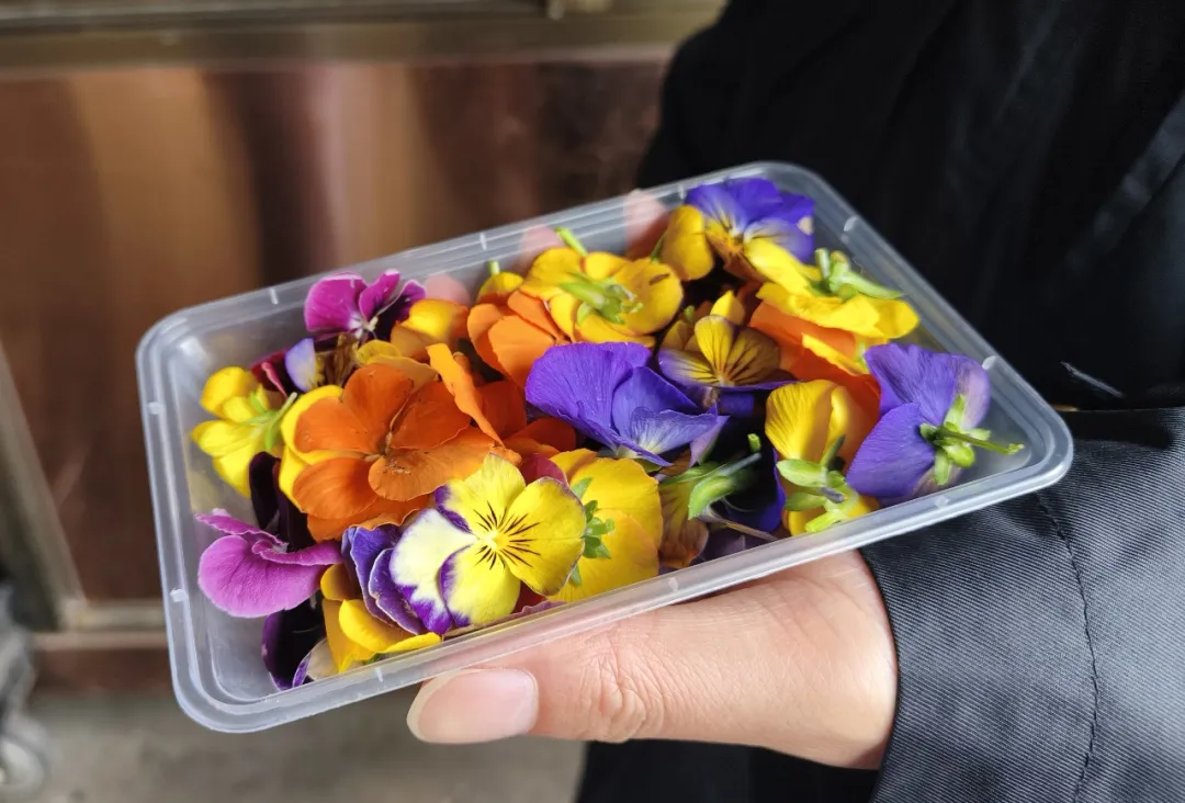 除了槐花、黄花菜,郑家贵的冷库里还藏着“颜值担当”——专门用来摆盘的花。“这是三色堇,饭店买回去,往菜肴一摆,立马就精致了,我们按盒卖,一盒才6块钱。”他指着另一盒翠绿的叶子补充,“还有这绿绣球花瓣,西餐、日料店最爱用,烘焙甜品点缀下,清新又高级,很受年轻人喜欢,拍照发圈都好看。”