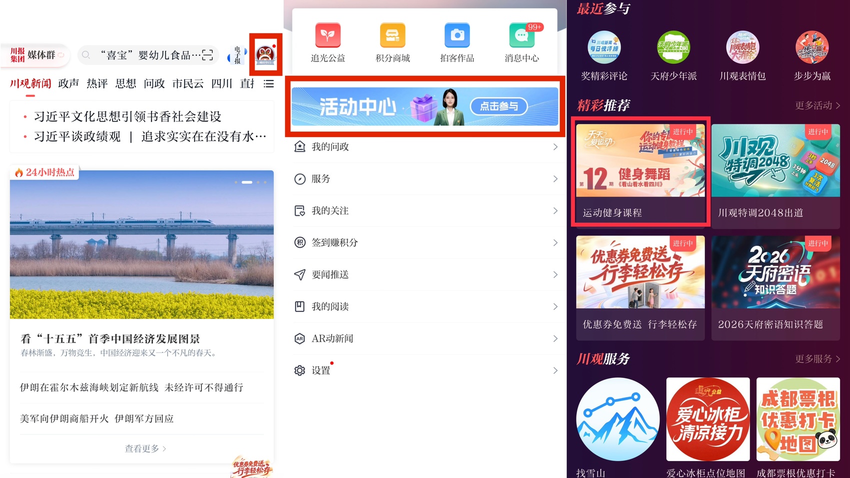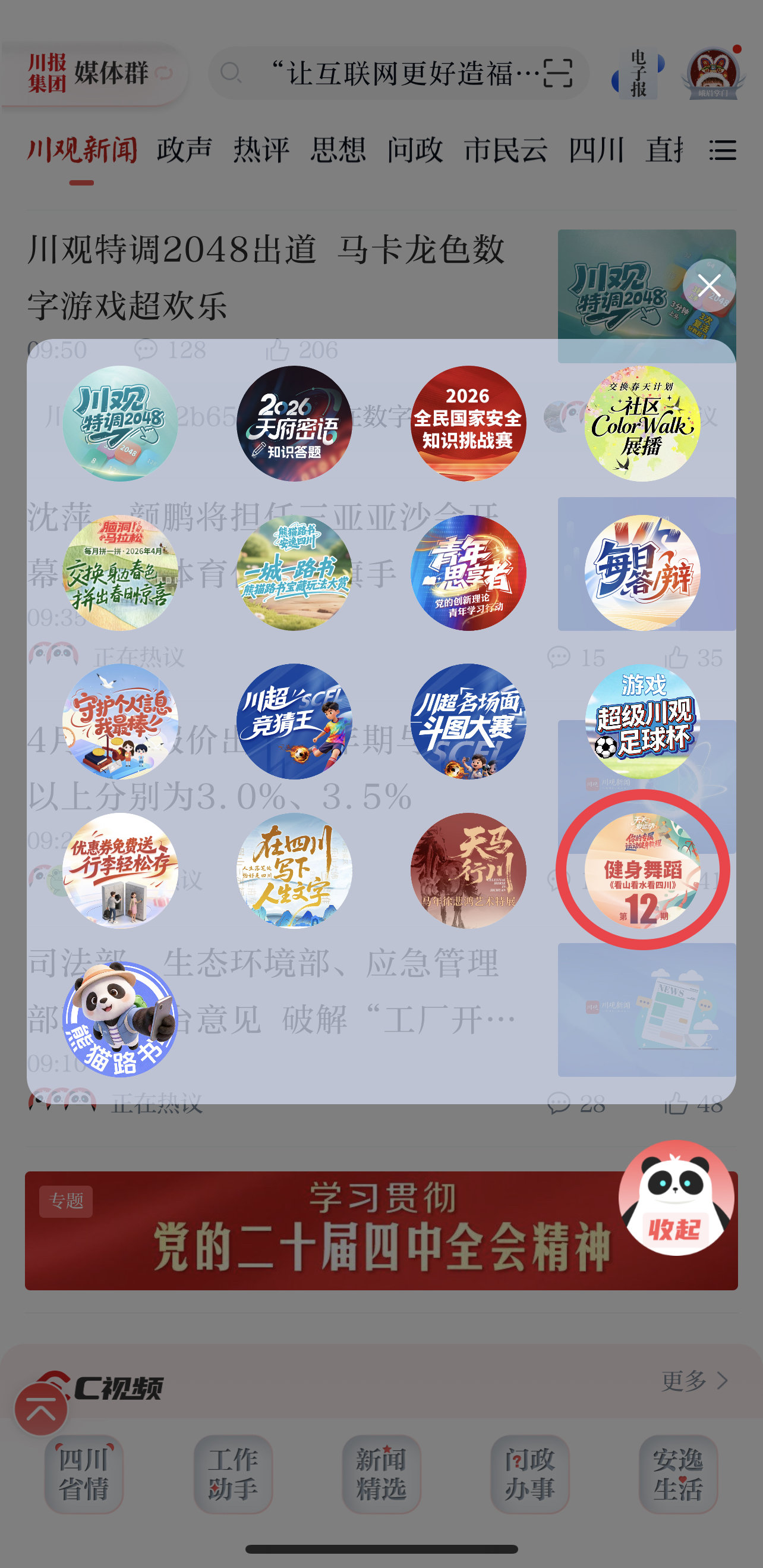 打开川观新闻App,首页右上角点击“我的头像”按钮,选择“活动中心”,找到“健身舞蹈”,点击即可进入。