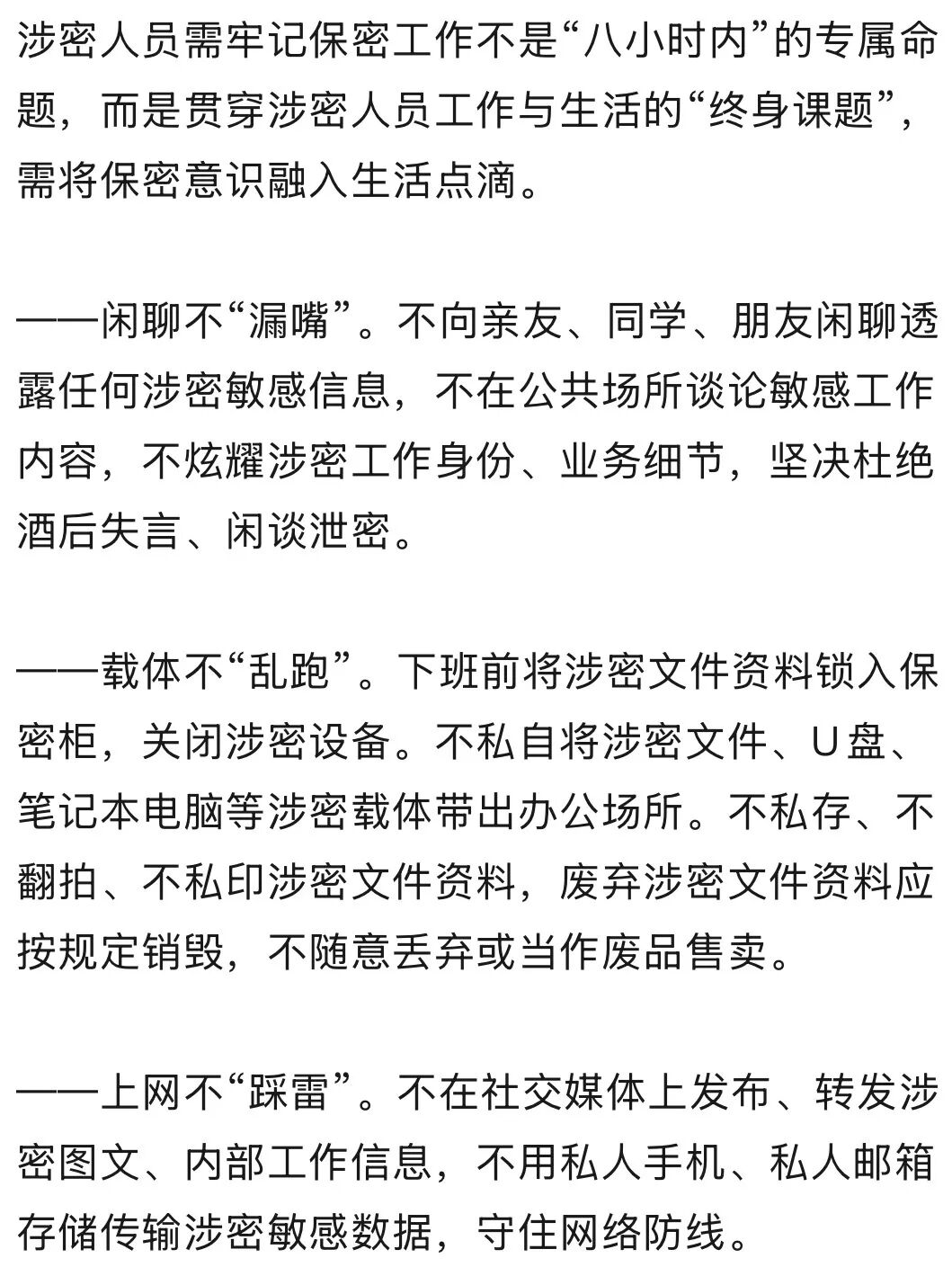 涉密人员一言一行,不仅关乎个人职业操守,更直接关系到单位保密甚至国家安全。八小时之外,看似离开了单位,实则仍处于保密防线延伸地带,一旦思想上滋生麻痹侥幸心理、放松自我约束,就会模糊公私边界,导致行为失范、底线失守,需要引起涉密人员高度重视。