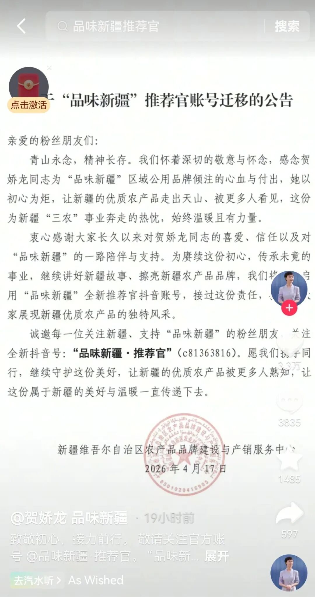 新疆维吾尔自治区农产品品牌建设与产销服务中心发布《关于“品味新疆”推荐官账号迁移的公告》,对贺娇龙账号及新开通账号的情况予以说明。