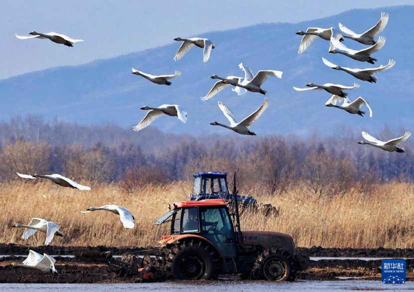 4月18日,在黑龙江省同江市的一处水田里,正在作业的农机和飞翔的天鹅相映成趣。