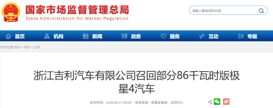 召回编号S2026M0045V:自2026年5月16日起,召回2023年11月16日至2024年5月24日期间生产的部分2023—2024年款配备86kWh动力电池的国产极星4纯电动车型,共计1473辆。