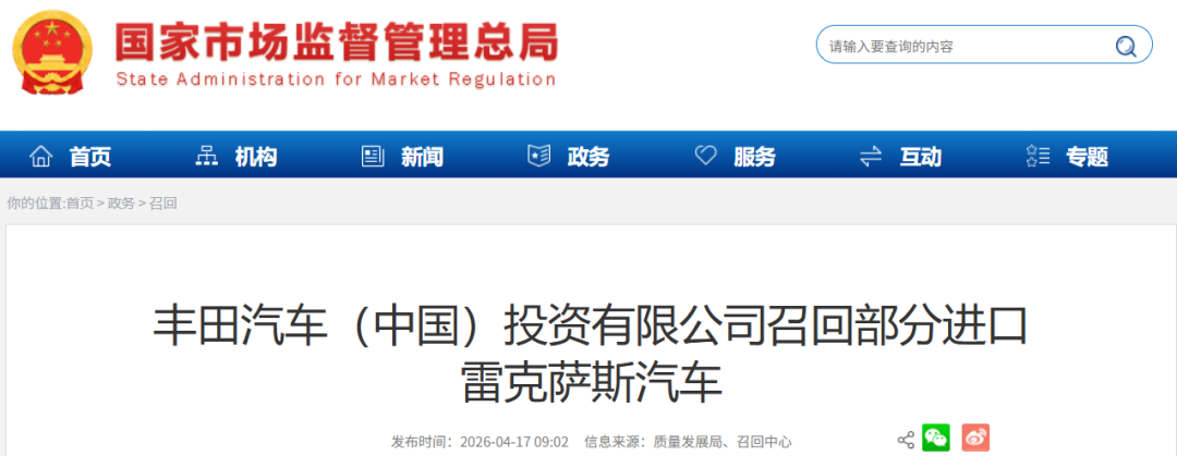 召回编号S2026M0044V:自即日起,召回2014年9月29日至2017年9月6日期间生产的部分进口雷克萨斯RC F汽车,共计56辆。