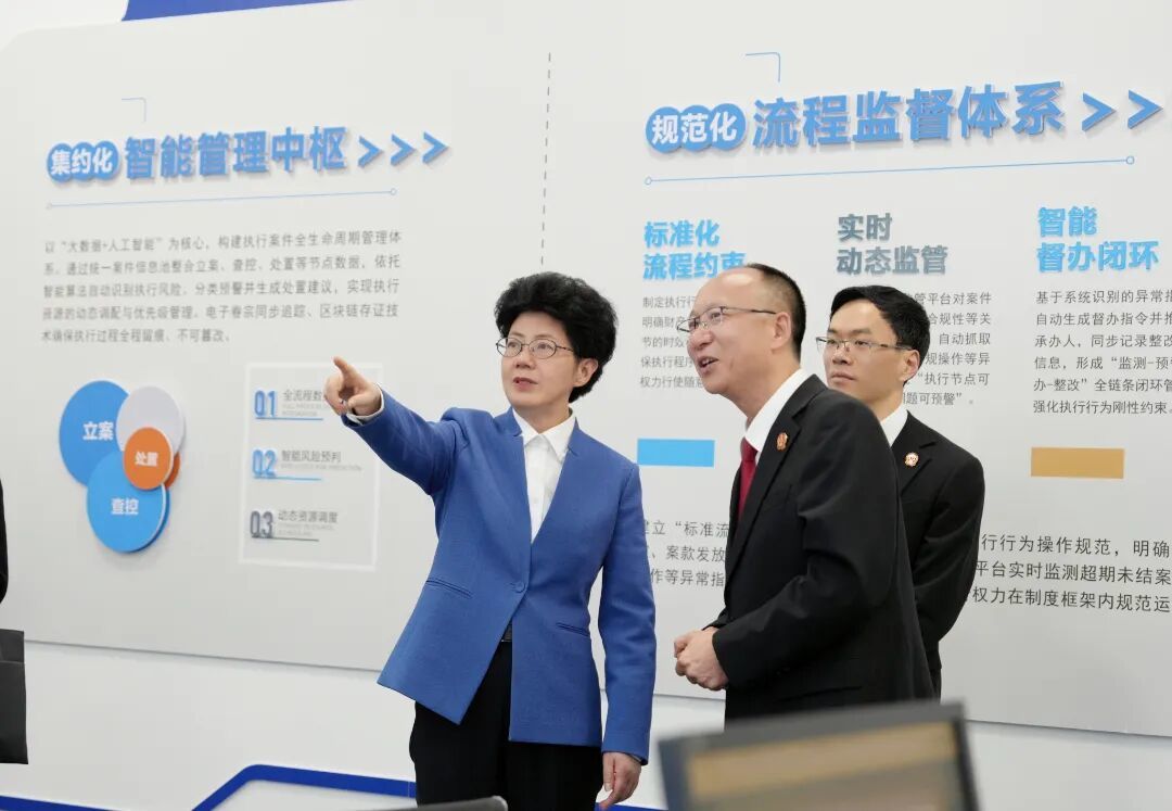 调研组首先前往中国(绵阳)科技城创新馆、绵阳市涪城区法院青义人民法庭、绵阳经济技术开发区人民法院及绵阳中院执行局。青义人民法庭是全省法院物业纠纷多元化解工作成绩突出集体,陈志君现场察看青义人民法庭智慧诉讼服务专员AI+数字人运行情况,并与省人大代表舒明英、刘玉华亲切交流,赞赏“村(社区)书记和事团”及工会参与调解在基层治理中的积极作用。在绵阳经济技术开发区人民法院,她深入筑映调解工作室、老黄调解工作室及和顺民商事调解中心,与人民调解员王均蓉、赵紫君,退休法官黄颂杰、蒋敏,以及工作人员刘涛、刘敏等深入交流,细致询问调解流程、工作心得与机制运行效果,对“银发力量”与多元调解力量有效提升解纷效能表示肯定。在绵阳中院执行局,陈志君现场观看了“子云e执”执行管理系统演示,对绵阳法院探索执行市域统管机制、推动执行工作提质增效的创新实践予以肯定。