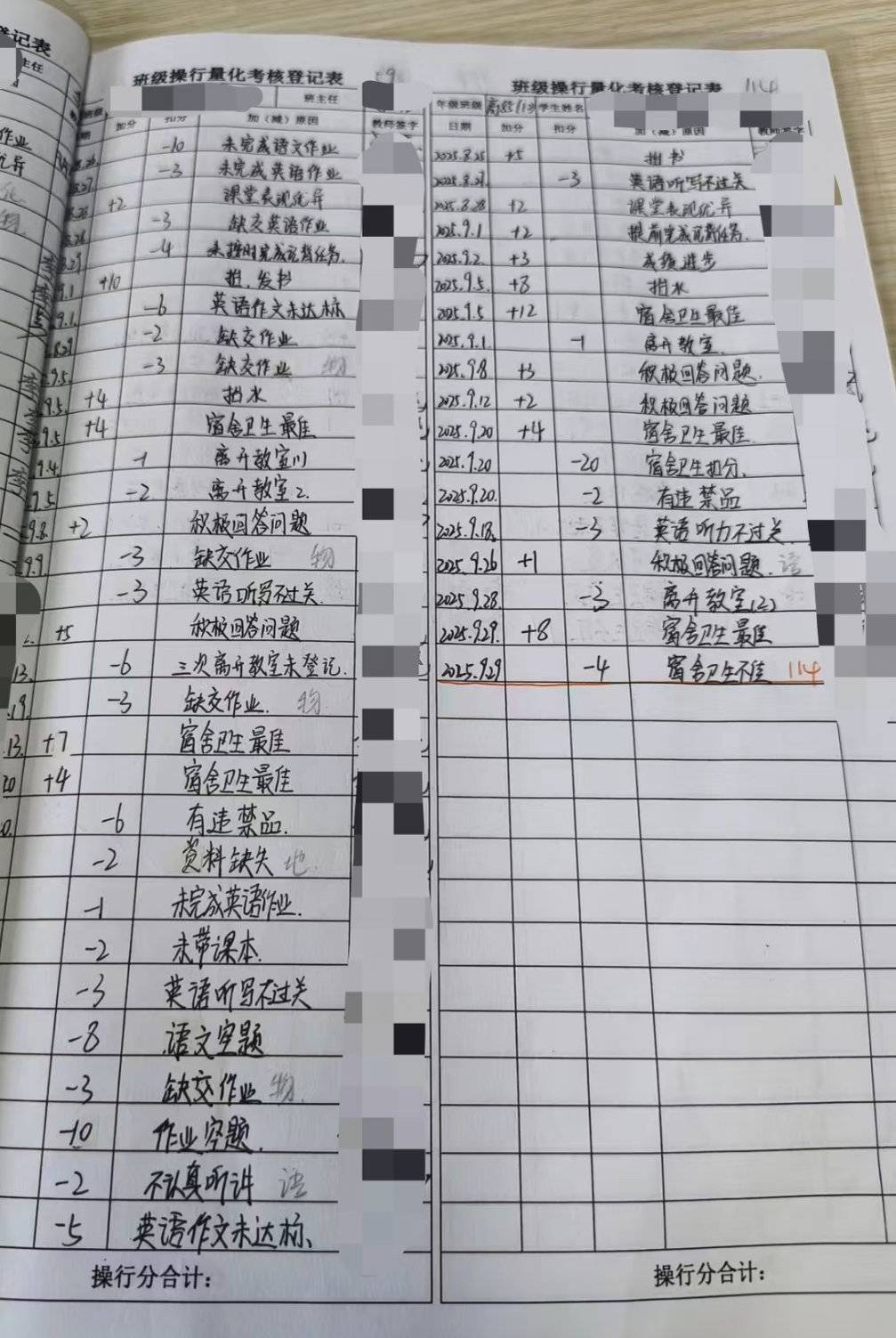 家属在网上公开的操行考核表中,“作业空题”“听写不合格”与“宿舍卫生扣分”并列,学生当月扣分127分、加分88分,操行评定为不合格。