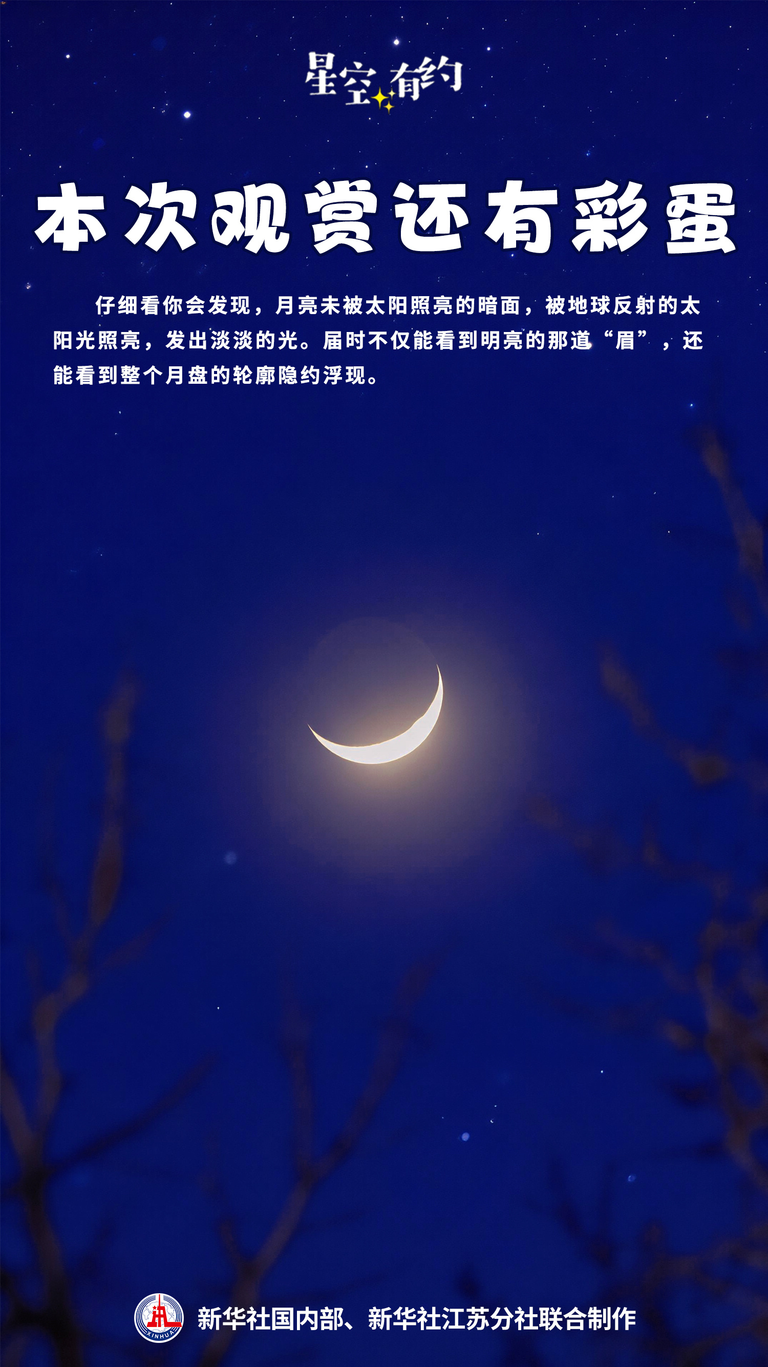 4月21日傍晚别忘抬头!今年最大、最亮的蛾眉月要来了,细弯弯像柳叶,还能看到“新月抱旧月”的奇景——暗面被地球反光照亮,整个月亮轮廓若隐若现。不用望远镜,肉眼就能看。春夜星空这份浪漫,千万别错过。
