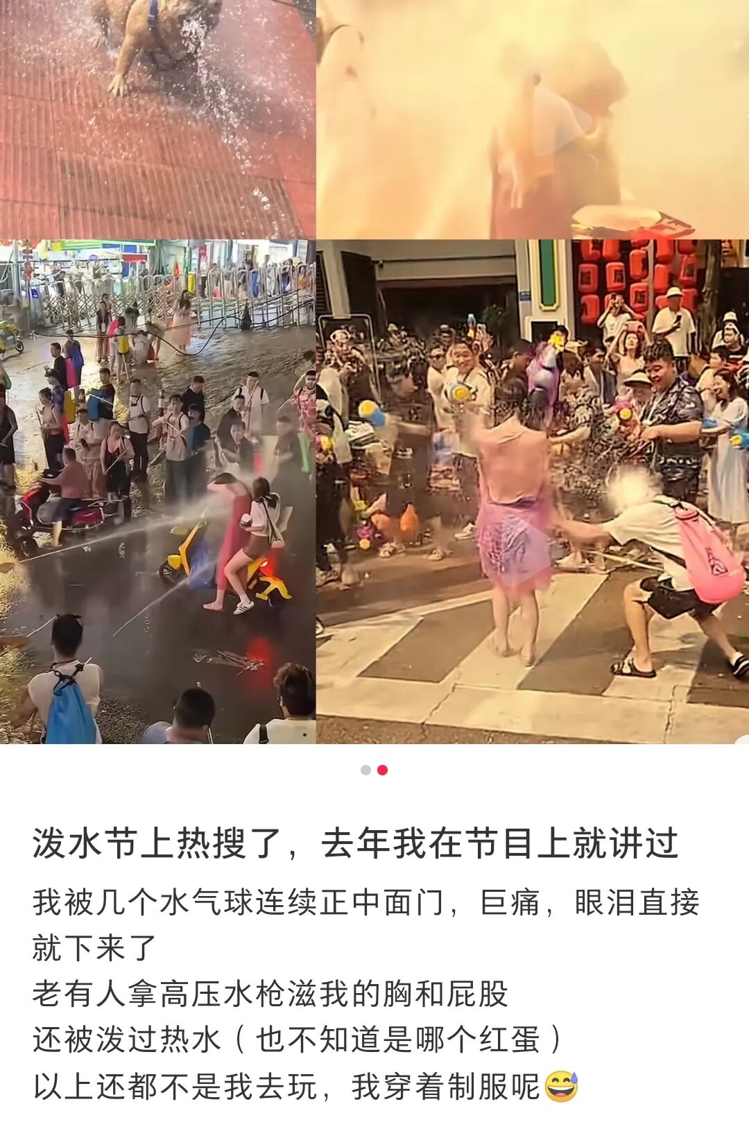 4月19日,曾在云南当过十几年警察的脱口秀演员“火锅”自曝自己在泼水节上被不文明行为干扰执勤的经历:“我被几个水气球连续正中面门,巨痛,眼泪直接就下来了。老有人拿高压水枪滋我的胸和屁股,还被泼过热水。以上还都不是我去玩,我穿着制服呢。”