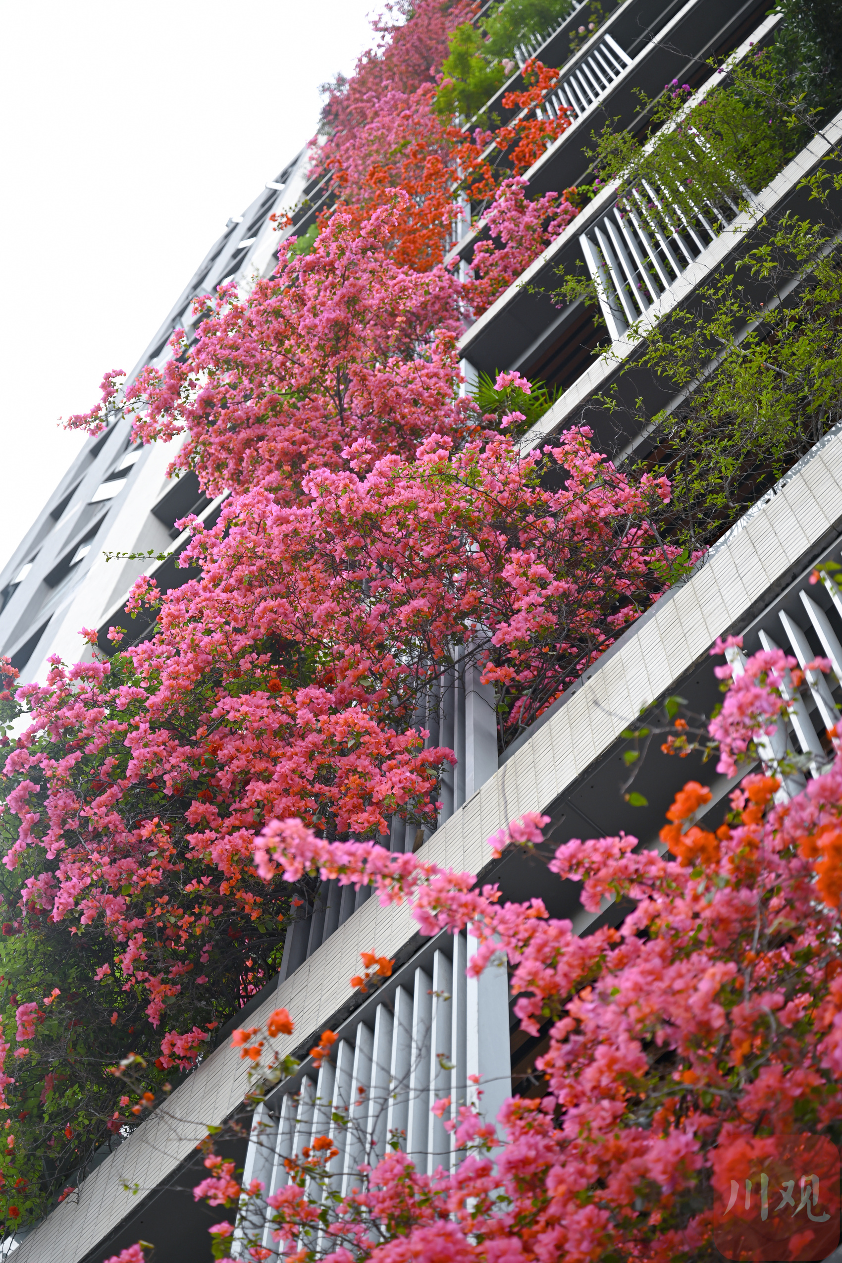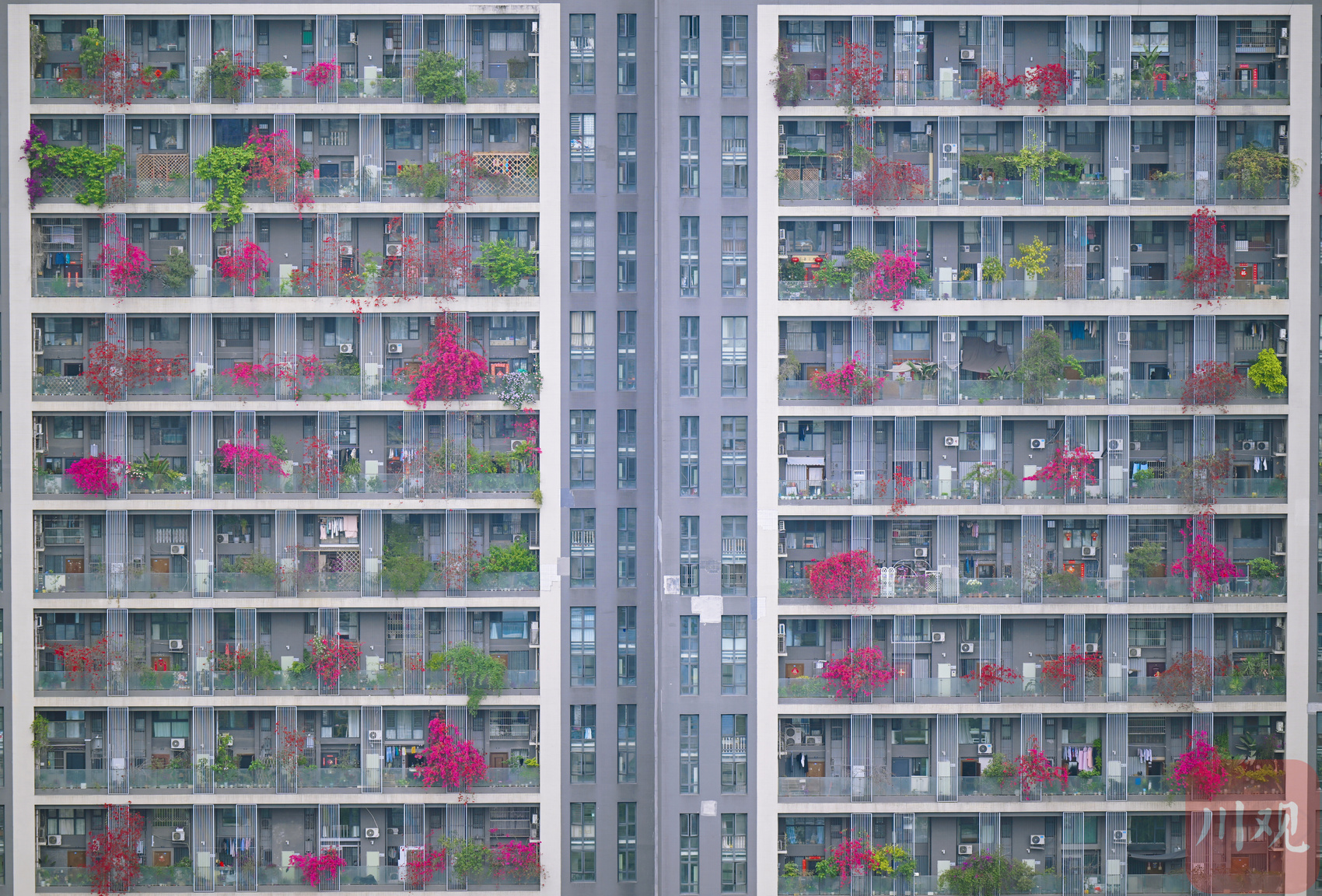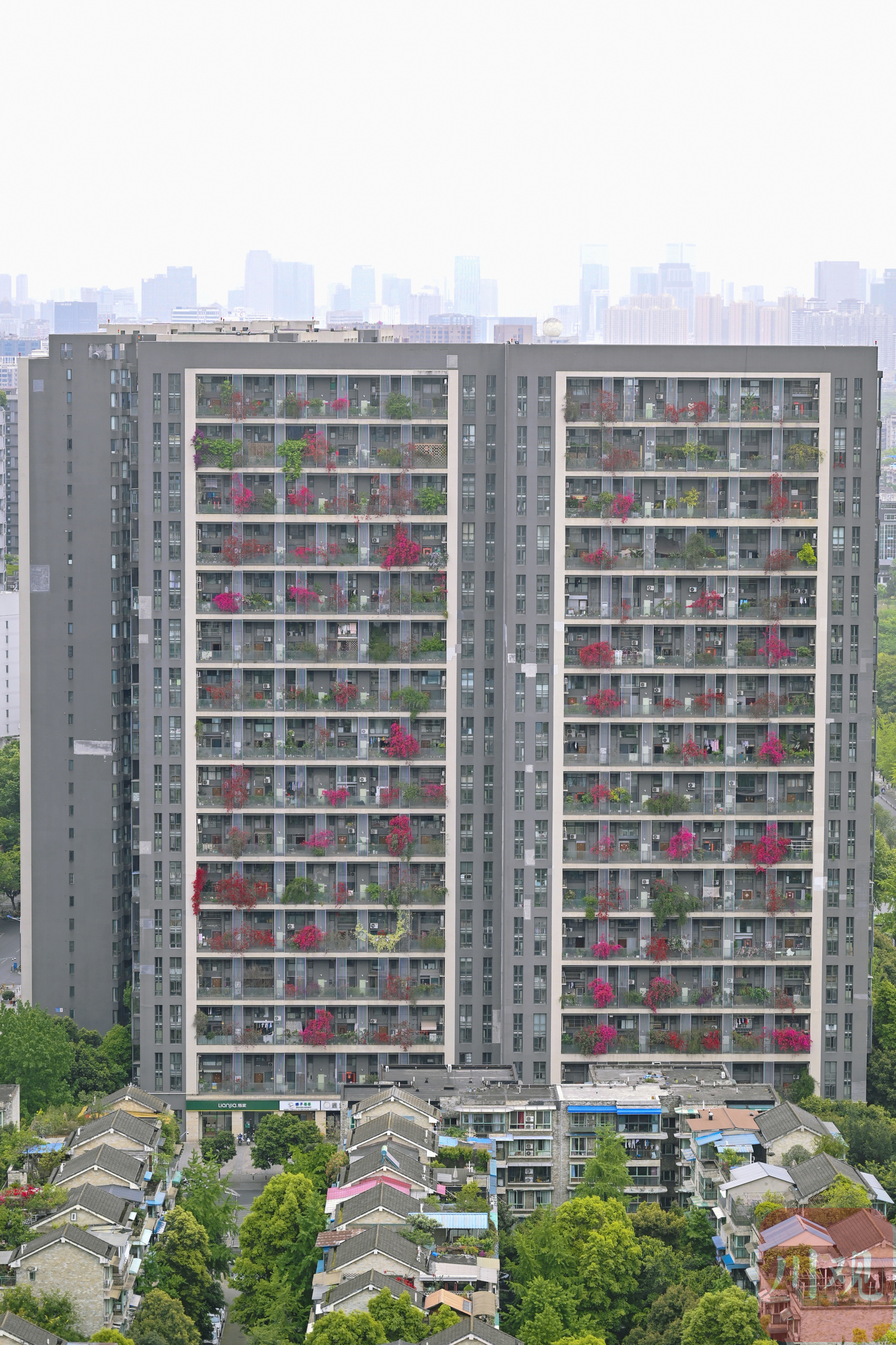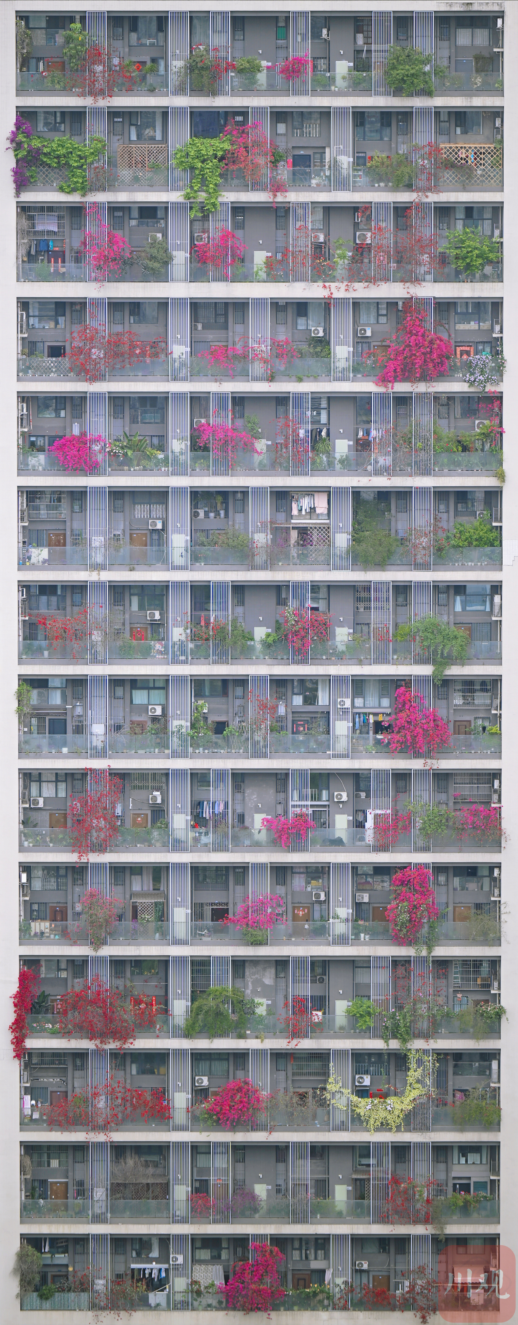 繁花从三十余层高楼倾泻而下,与阳台绿植相映成趣,勾勒出从顶楼到楼底“户户见花”的别样景致,成为城市里一道亮眼的春日风景线。