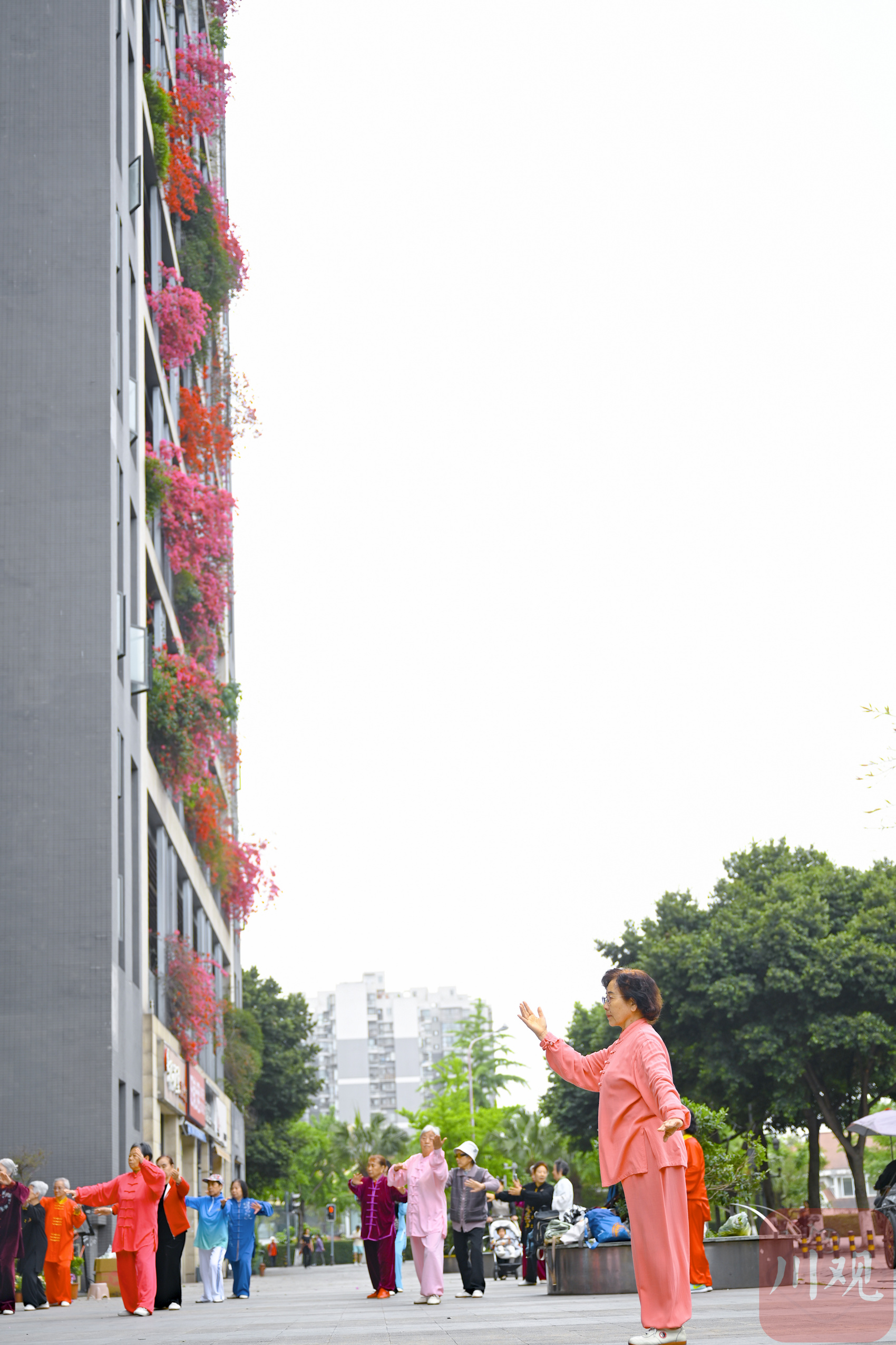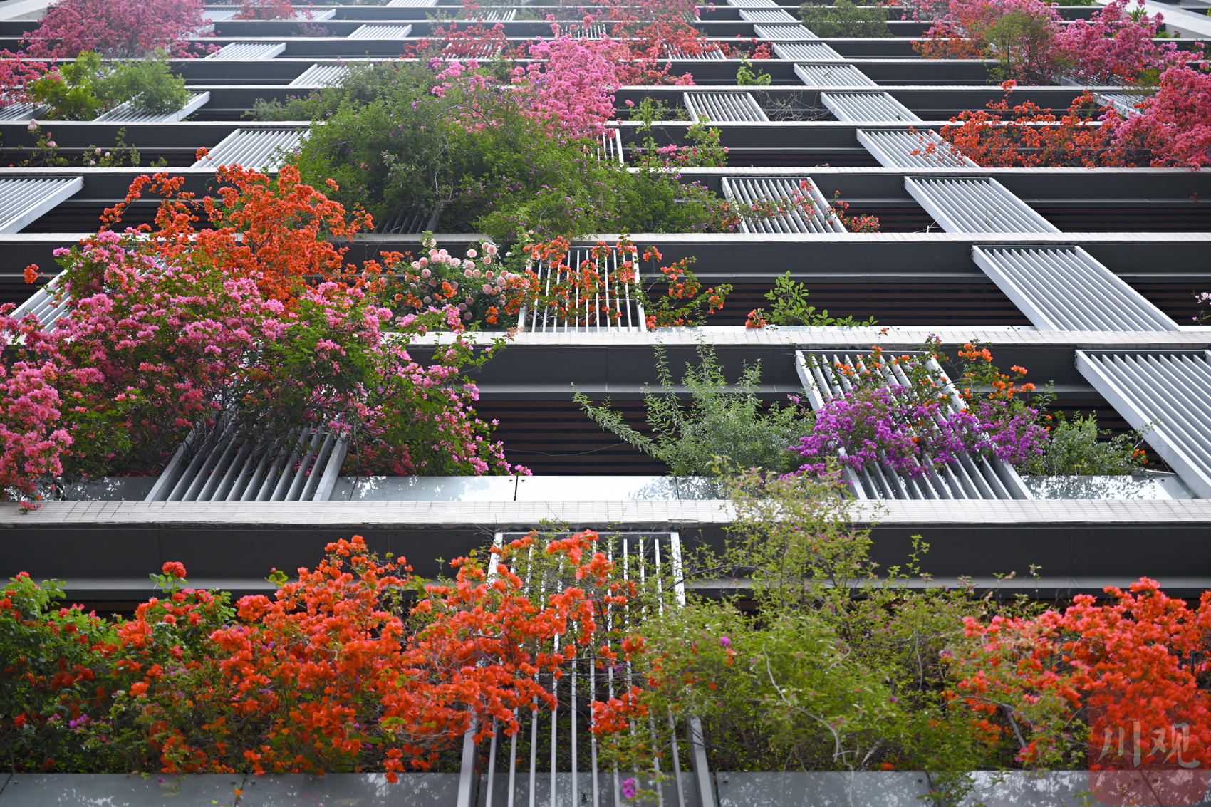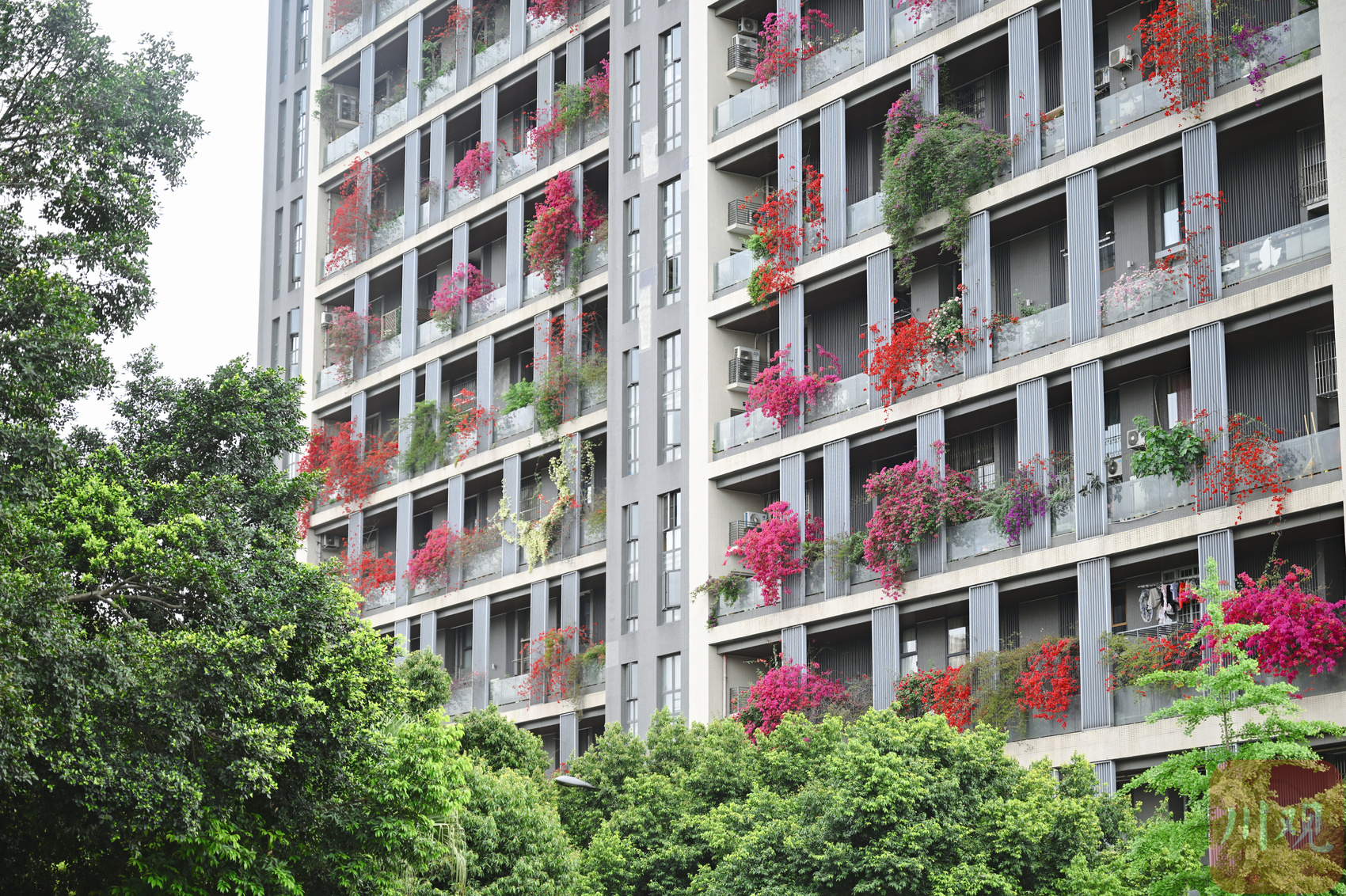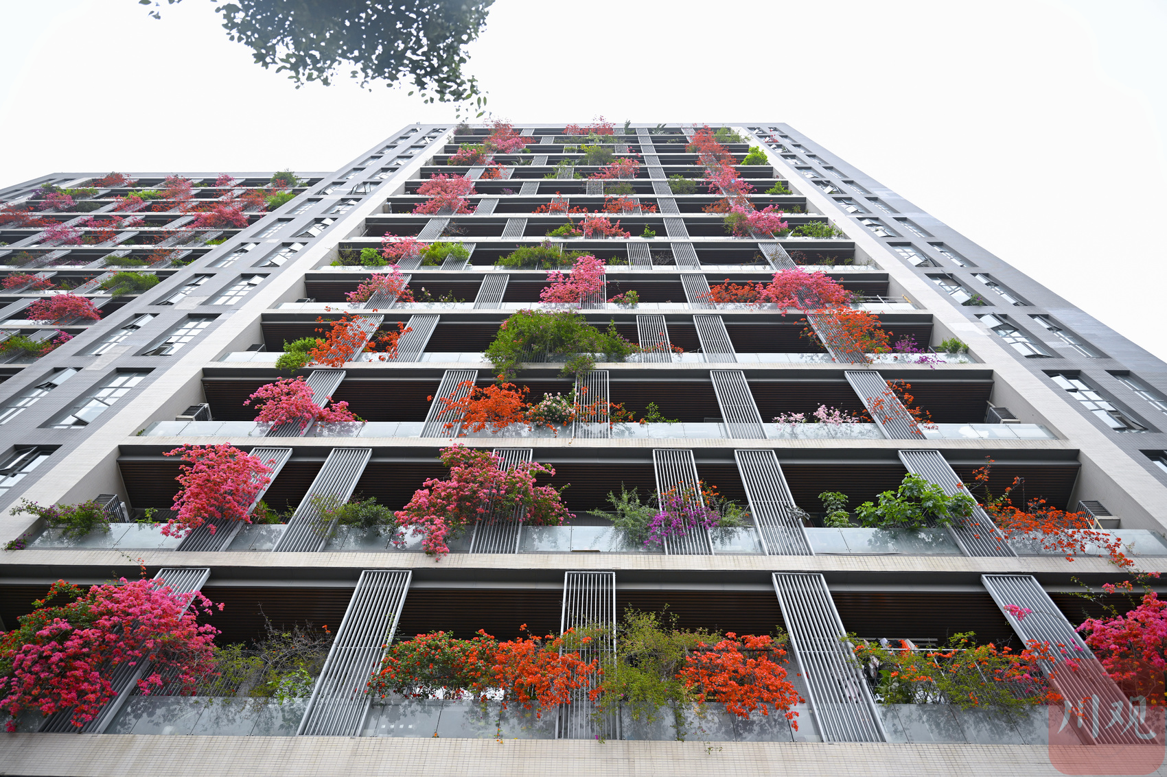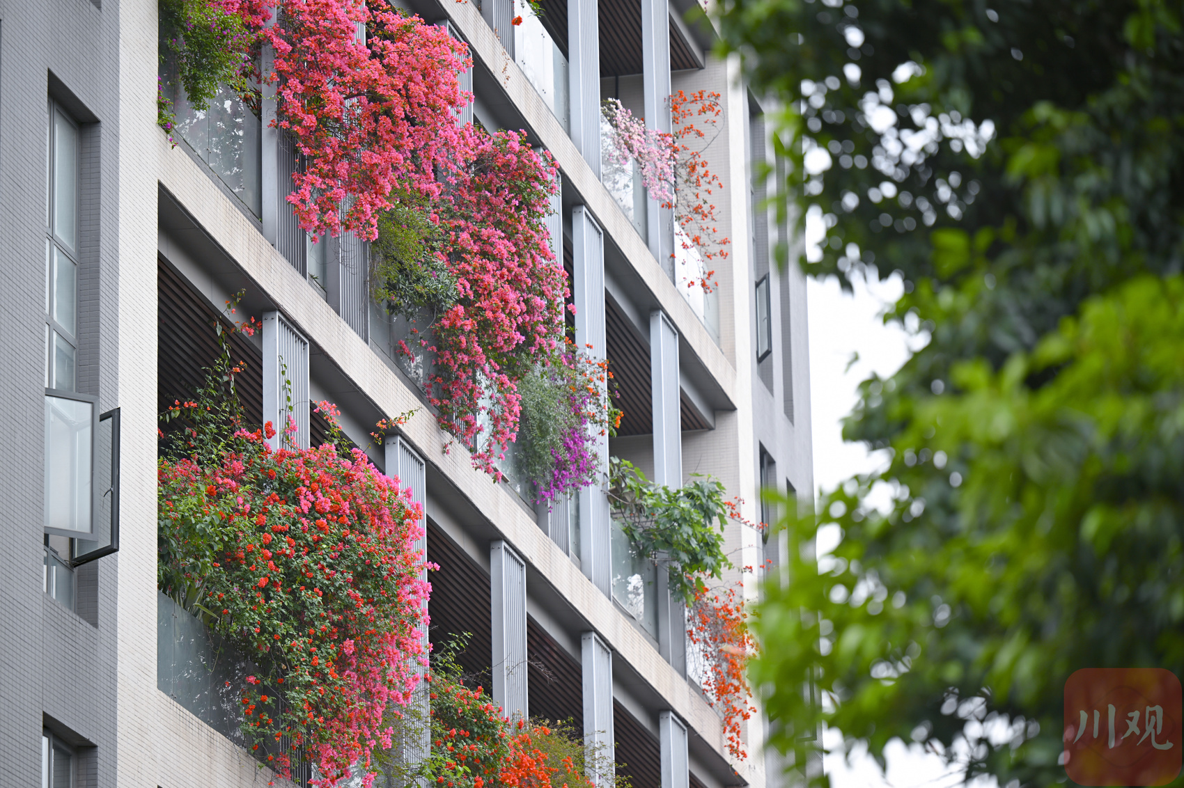 繁花从三十余层高楼倾泻而下,与阳台绿植相映成趣,勾勒出从顶楼到楼底“户户见花”的别样景致,成为城市里一道亮眼的春日风景线。