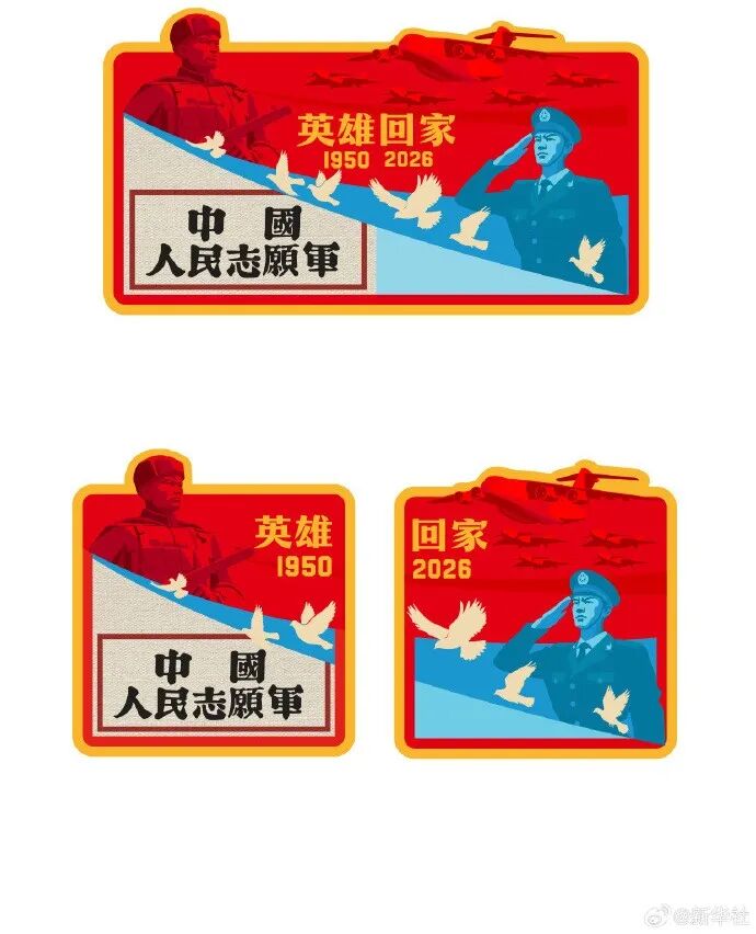 接迎第十三批在韩志愿军烈士遗骸回国任务标识由志愿军战士雕塑、中国人民志愿军胸章、运-20B与4架歼-20编队、新时代官兵、和平鸽等图案组成,配有“英雄1950”“回家2026”字样,寓意着英雄回家、血脉传承,寄托着铭记历史、缅怀先烈的真挚情感。