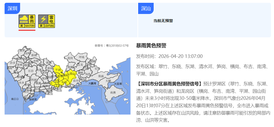 【深圳市分区暴雨黄色预警信号】预计罗湖区(翠竹、东晓、东湖、清水河、笋岗街道)和龙岗区(横岗、布吉、南湾、平湖、园山街道)未来3小时将出现30-50毫米降水,深圳市气象台2026年04月20日13时07分在上述区域发布暴雨黄色预警信号,全市进入暴雨戒备状态。