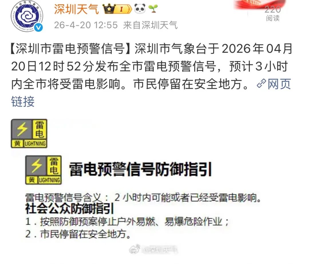 【深圳市雷电预警信号】深圳市气象台于2026年04月20日12时52分发布全市雷电预警信号,预计3小时内全市将受雷电影响。市民停留在安全地方。
