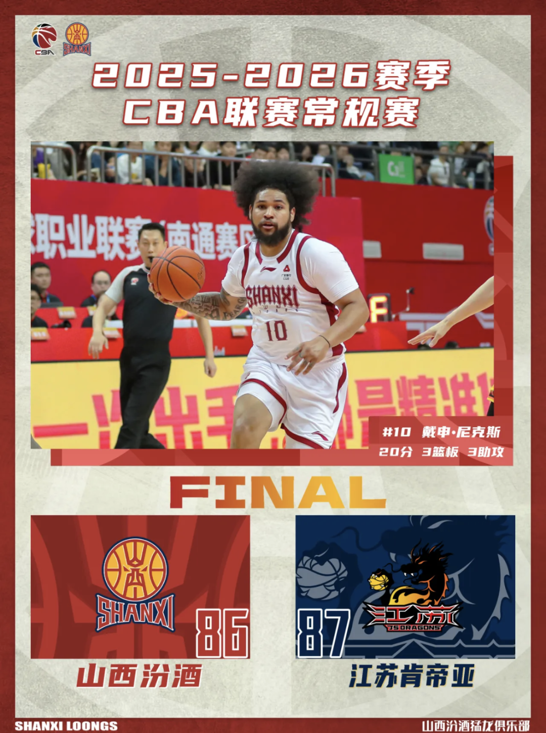 4月18日,2025-2026赛季CBA联赛战罢常规赛第40轮,山西汾酒男篮客场以86比87惜败江苏队。此战之前,山西男篮已提前锁定季后赛参赛资格。