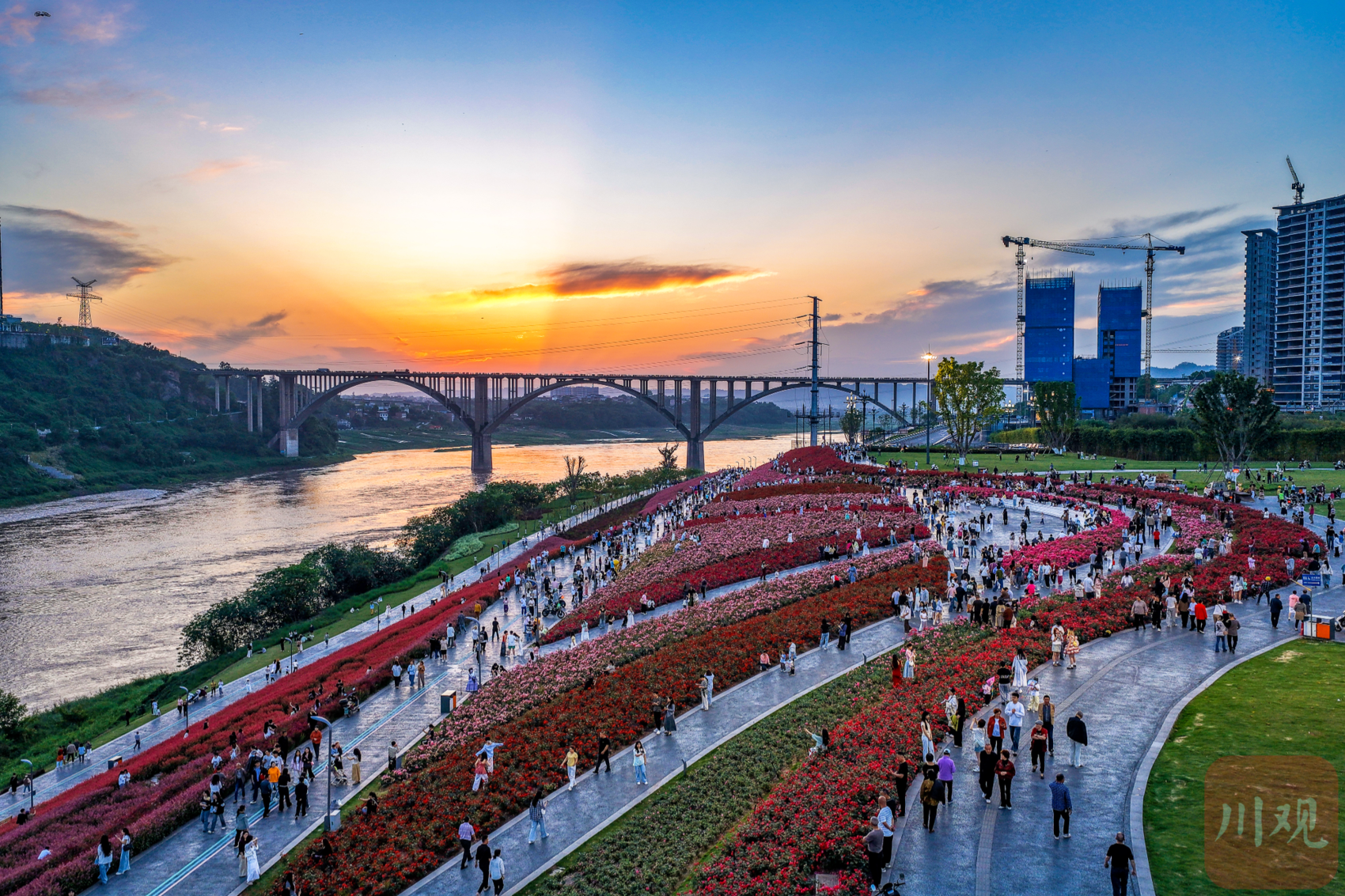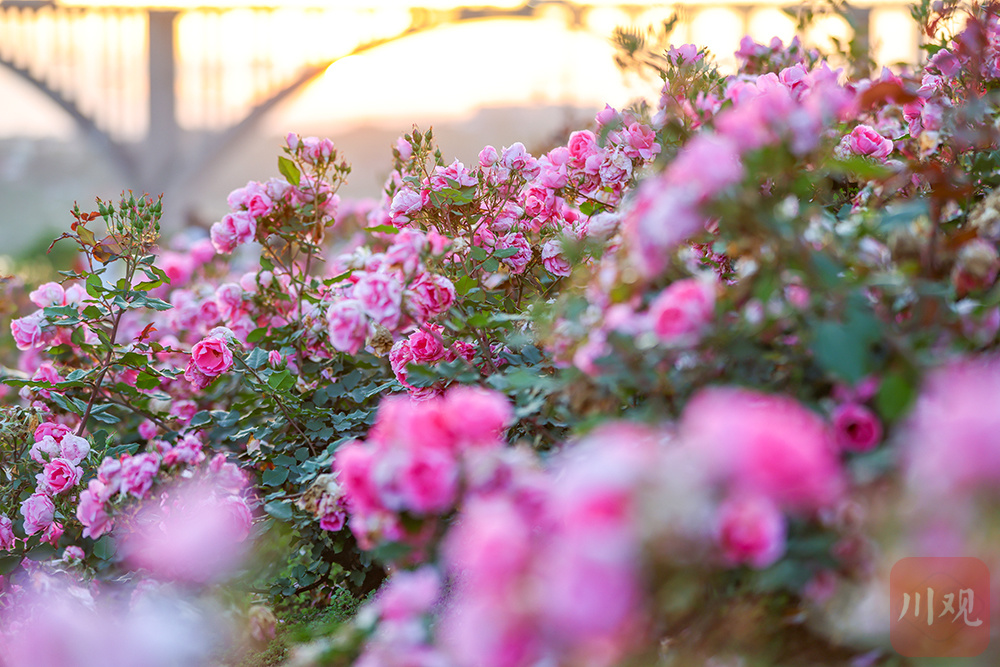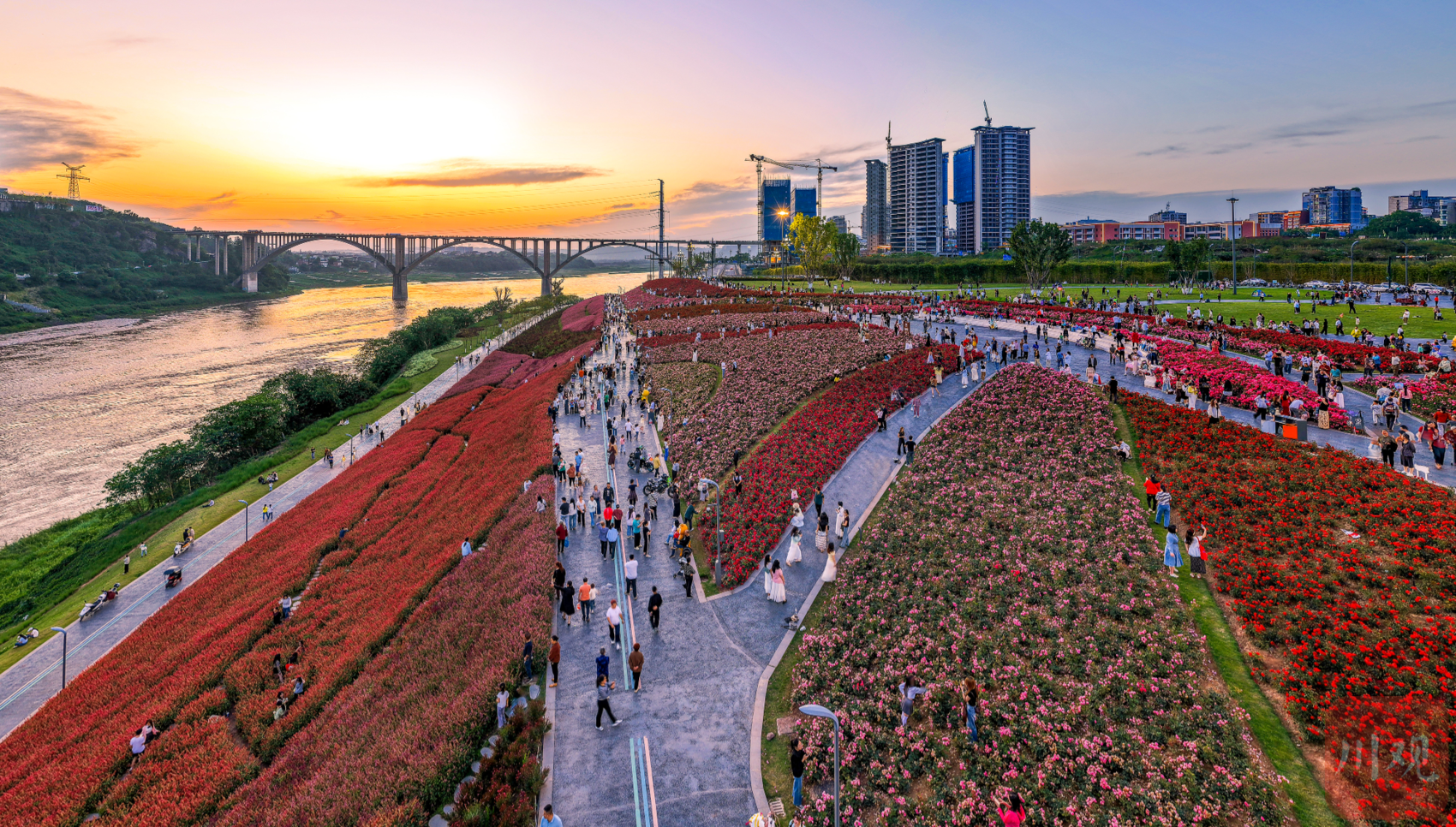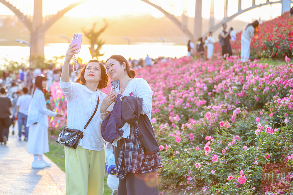 2026年4月17日,四川宜宾翠屏区岷江花海暮色如画,游客漫步赏花。4月以来,宜宾市翠屏区安阜街道岷江花海迎来盛花期,近2万平方米月季、蔷薇在暮色与岷江江水映衬下竞相绽放,吸引不少市民游客前来打卡拍照,尽享春日江畔美景。