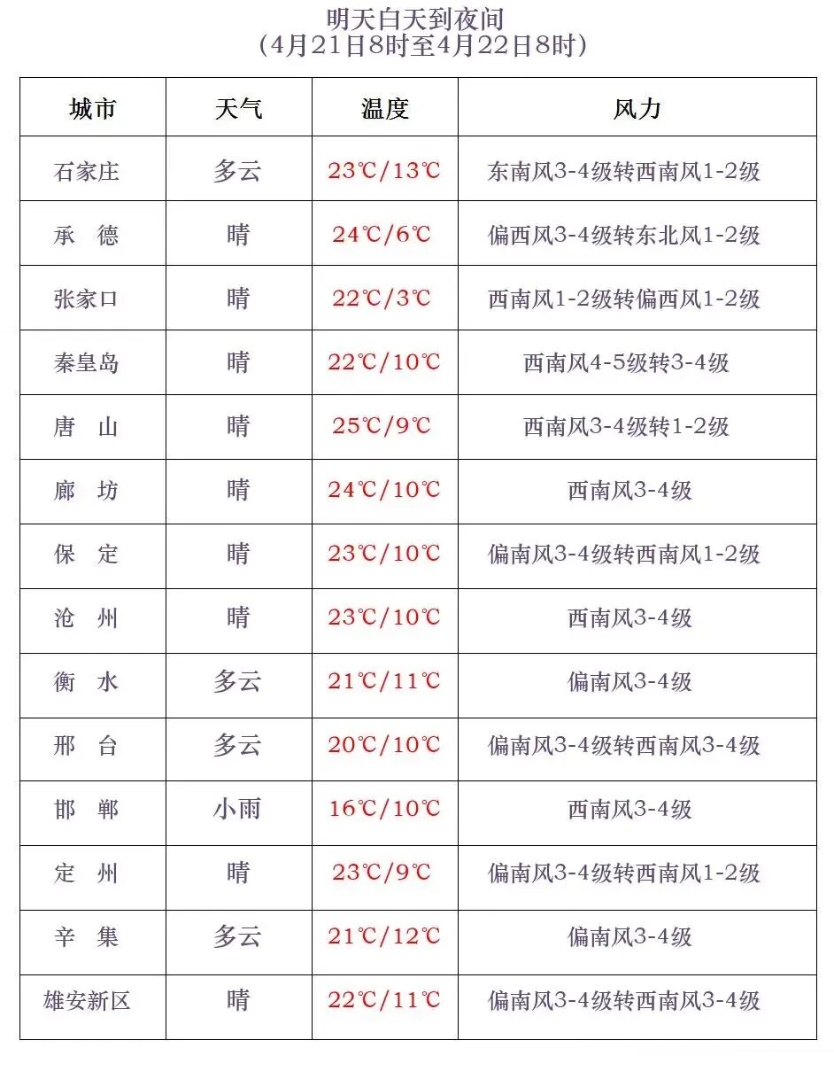 明天夜间到22日,石家庄、沧州以南地区多云间晴,其中邯郸阴有小雨或阵雨转多云,其他地区晴转多云。