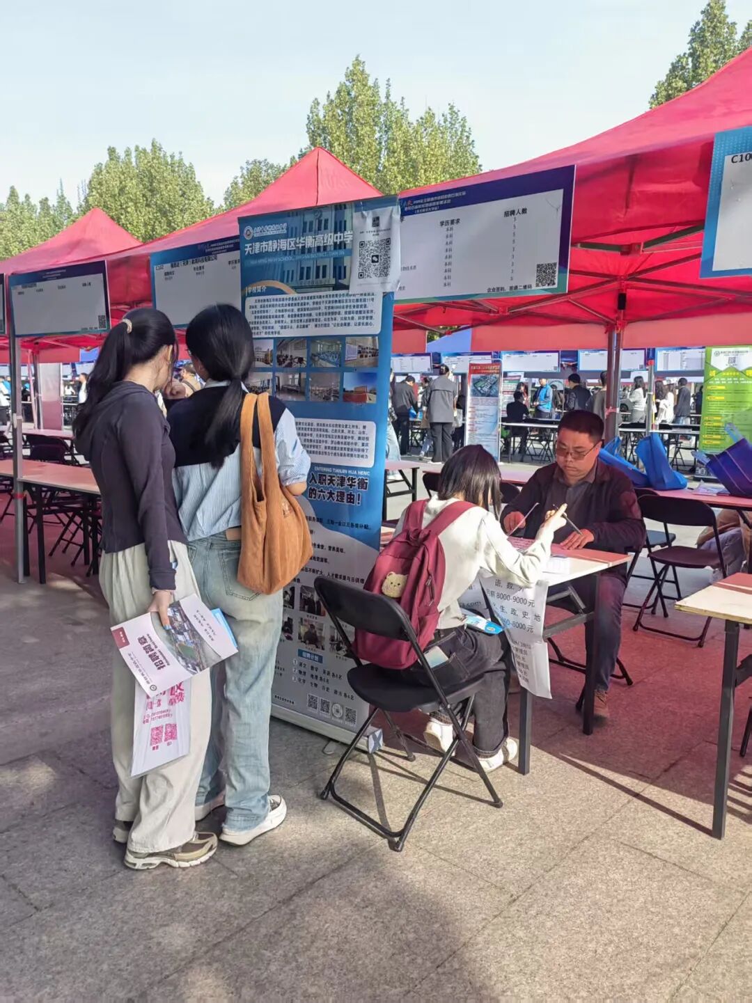 在天津市北京师范大学实验学校展位前,“年薪15-21万元,六险三金”的标语格外抢眼,吸引大量毕业生驻足。一名求职的硕士生表示:“这所学校不仅可以落户天津,还是公立学校,薪资待遇也很有吸引力。”