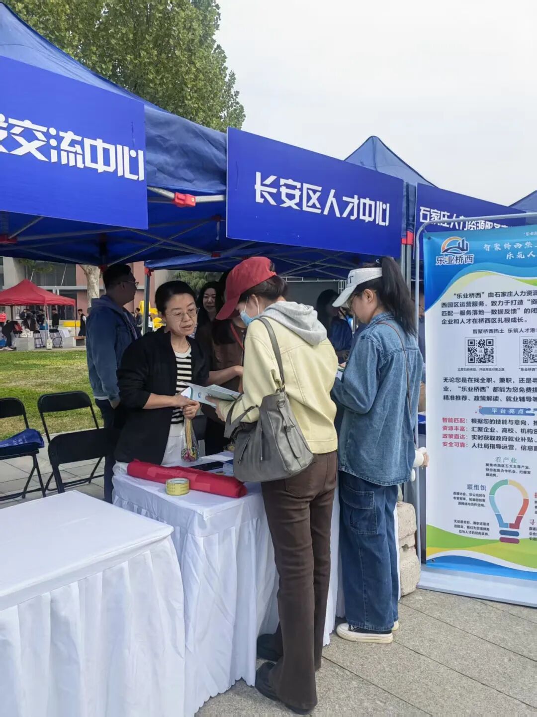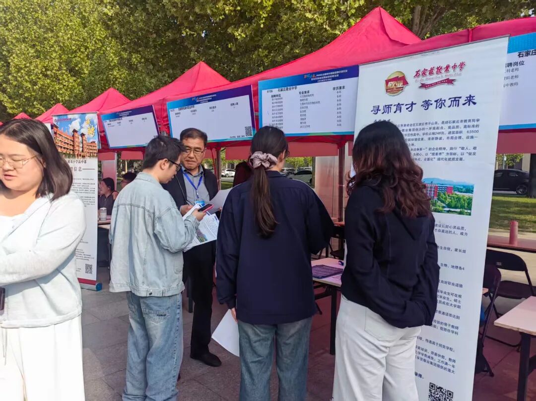 招聘会现场,石家庄市部分县(市、区)人社部门、石家庄人力资源服务产业园等单位的工作人员也通过政策宣传、就业信息推送等扎实服务,助力毕业生更好就业。