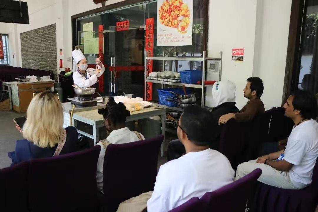 博物馆内,不同国籍的留学生因文化共鸣,成为一道跨越国界的青春风景线。结束古城非遗博物馆的体验后,留学生们走进成都川菜博物馆,依次参观典藏馆、传统豆瓣晾晒场,近距离观摩川菜大厨现场烹制经典川菜,亲口品尝地道川味佳肴,在“一菜一格、百菜百味”的独特魅力中深度感知郫都饮食文化的深厚底蕴。本次活动不仅是一场沉浸式的民间文艺体验、色香味俱全的舌尖美食盛宴,更是郫都区扎实推进民间文艺保护传承、助力本土文化走向国际舞台的生动实践。