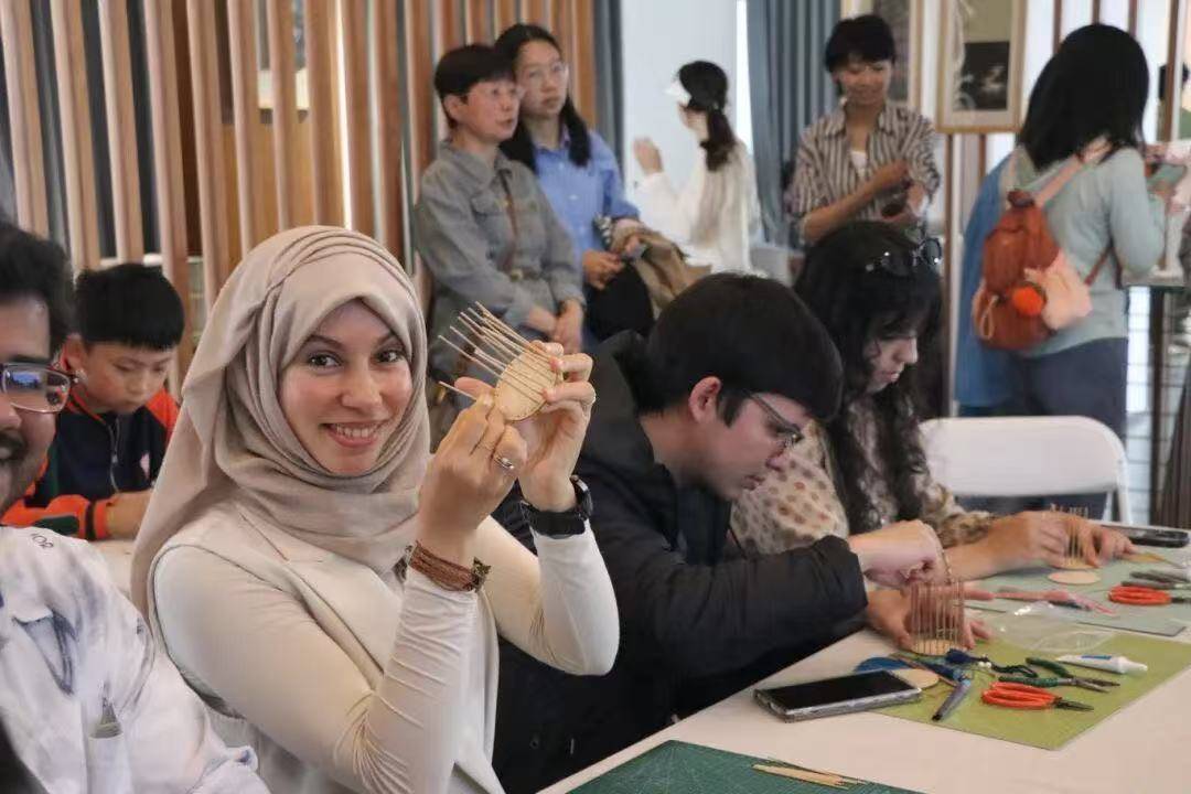 4月18日,成都市郫都区国际留学生民间文艺体验活动在古城非遗博物馆举行。来自摩洛哥、巴基斯坦、孟加拉国、南非、阿尔及利亚、尼日利亚、波兰、德国、委内瑞拉、也门、埃塞尔比亚、印度尼西亚等14国家的20名国际留学生,刚一踏入展馆便被琳琅满目的藏品深深震撼,眼神里满是新奇与赞叹。在馆长雁鸿的带领下,他们观展、听讲、动手创作……沉浸式感受螺钿、竹编等传统技艺的独特魅力,在指尖与匠心的碰撞中,品味中国文化、爱上郫都民间文艺。