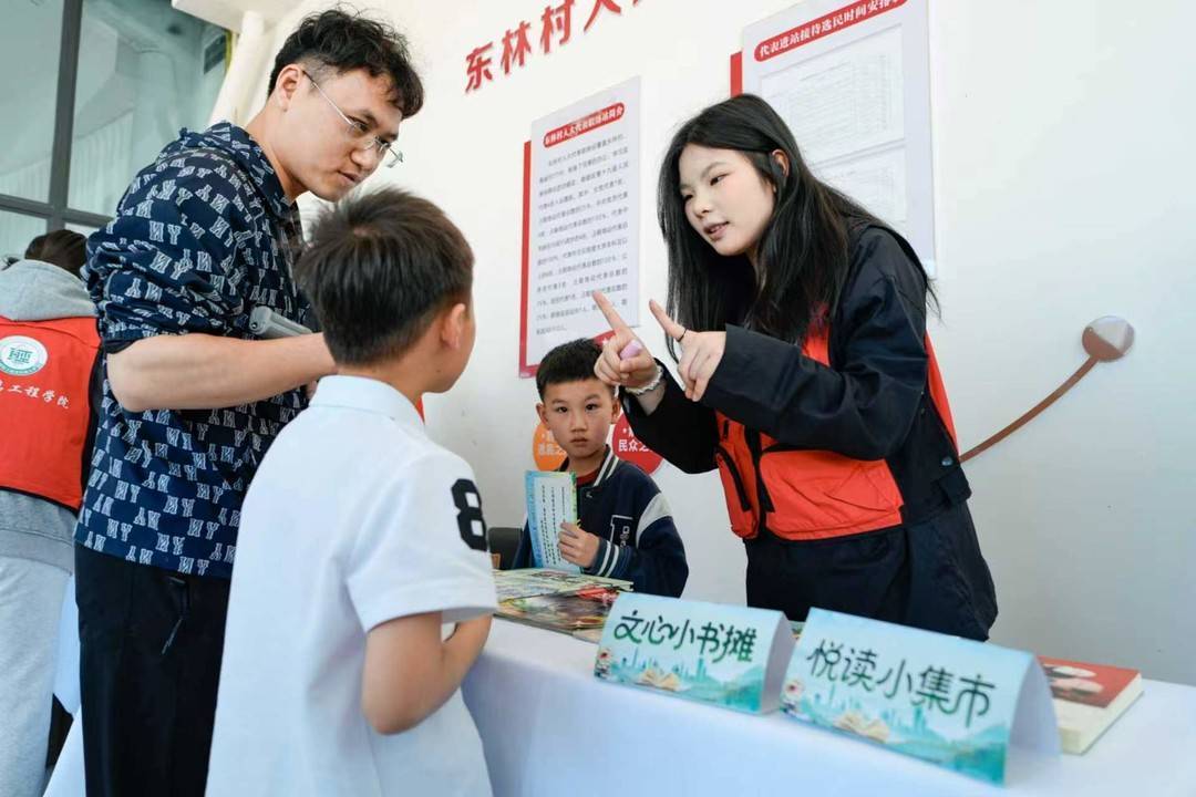 一大早,东林村农家书屋早已人头攒动。家长牵着孩子的手有序签到,现场工作人员为每组家庭发放 20 元购书券、10 枚交换币与集章打卡通行证,不少小朋友迫不及待地翻看手中的活动指南,眼神里满是期待。随着节奏明快的快板表演登场,活动正式拉开帷幕。朗朗上口的词句搭配生动的表演,瞬间点燃现场气氛,赢得阵阵掌声。