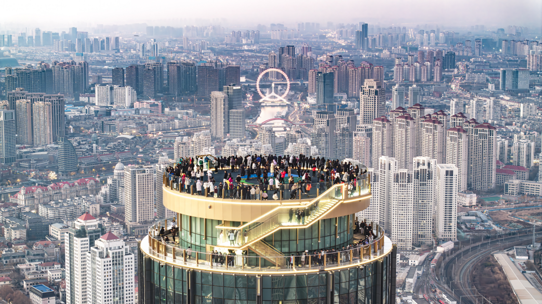作为华北首个集“震撼体验、品质社交、轻奢消费”于一体的复合型高空空间,津湾云顶融合全户外平台、“天空之镜”的极致观景、环形玻璃栈道的心跳体验、空中会客厅的云端商务以及高空咖啡的潮流社交。
