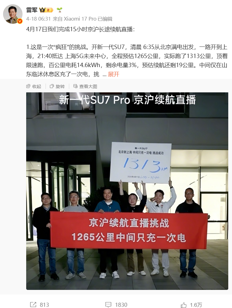 4月18日,雷军发长文总结道,“这是一次‘疯狂’的挑战。开新一代SU7,清晨6:35从北京满电出发,一路开到上海,21:40抵达上海5G未来中心,全程预估1265公里,实际跑了1313公里,顶着限速跑,百公里电耗14.6kWh,剩余电量3%,预估续航还剩19公里。中间仅在山东临沭休息区充了一次电,挑战成功!”