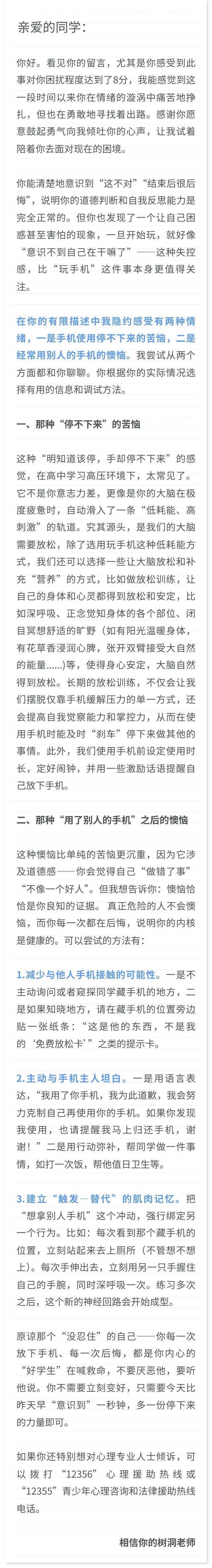 一位18岁高中男生:同学有人藏手机,我老是忍不住去玩他的,但只要玩上了就意识不到自己在干嘛了,结束后很后悔,可下次还是一样。