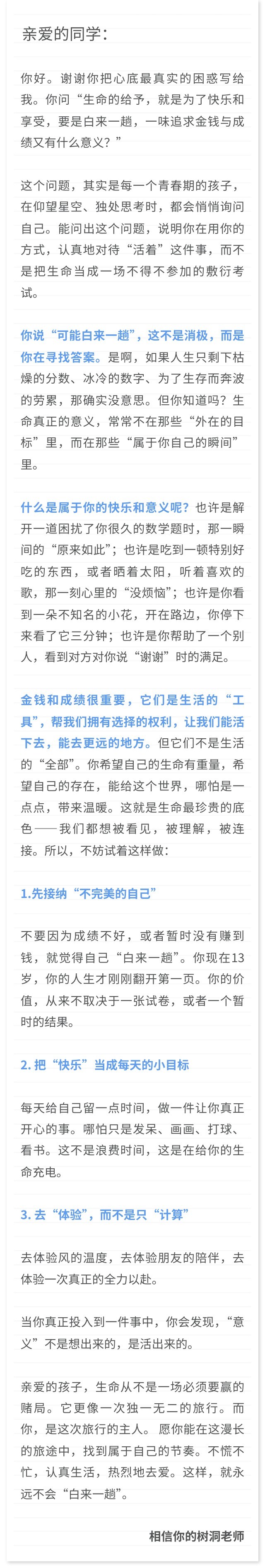 一位13岁初中男生:生命的给予,就是为了快乐和享受,会白来一趟,一味的追求金钱与成绩又有什么意义?