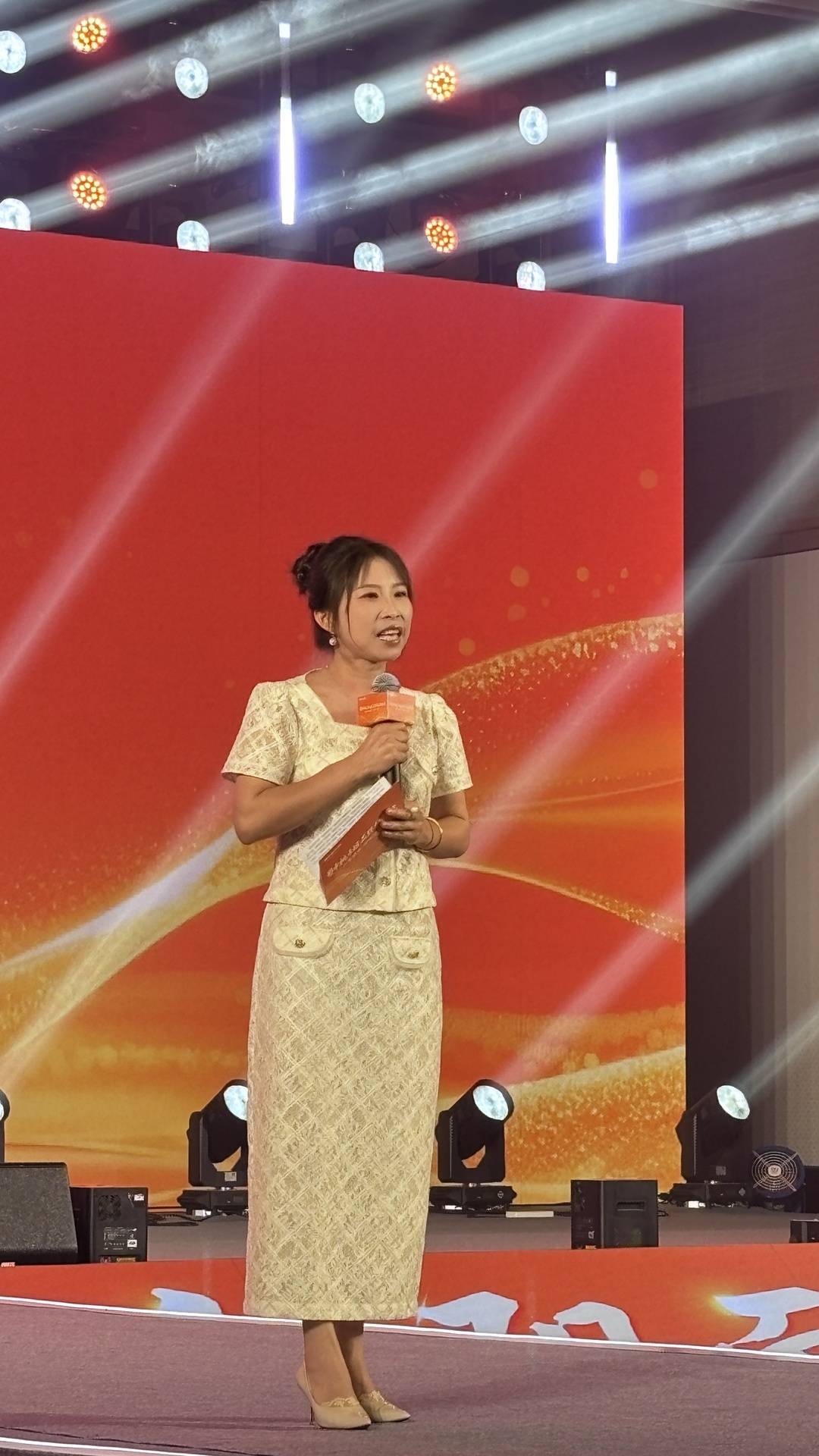 在龚向桃发言后,一位“95后”员工走上台,分享了自己的成长故事。她2020年入职,从一名普通客服做起,后来公司发展直播,她零基础转岗成为主播,不断摸索和突破自我,从直播小白慢慢成为专业主播,如今有了自己的粉丝和工作节奏。她坦言自己曾经只想安安稳稳过一辈子,如今肩上的责任却让她更加努力。