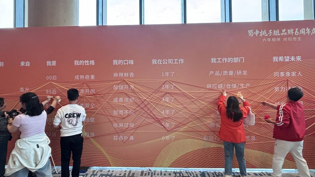 庆典现场,封面新闻记者看到,序厅打卡区整体以温暖的橙色调为主,背景板设计独具巧思,上面印有性别、年龄、性格、口味、在公司工作时间以及对未来的希望等选项,员工们可以根据自己的情况自由填涂,形成一幅五彩斑斓的“大家庭画像”。此外,现场还设置了妙趣横生的惊喜抽盲盒环节,不少人都抽中了“蜀中桃子姐”品牌的“网红”爆款产品,笑声不断。