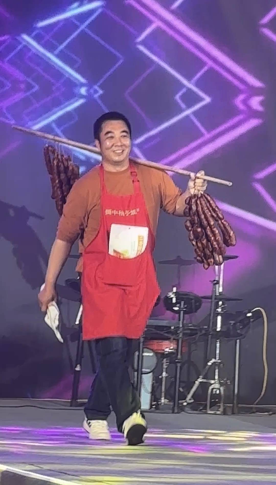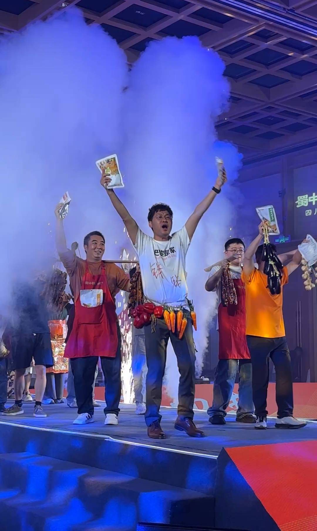 晚会开始后,员工们手持品牌所有产品依次走秀——钵钵鸡调料、香肠、手撕兔、四川凉面……熟悉的川味美食在动感的音乐和节奏感拉满的步伐中登场,引发全场欢呼与掌声。随后的颁奖典礼上,依次颁发了2025年度个人专项奖、优秀员工奖、优秀团队奖,以及分量最重的 “五载同心奖”,员工们的努力被看见,收获满满。