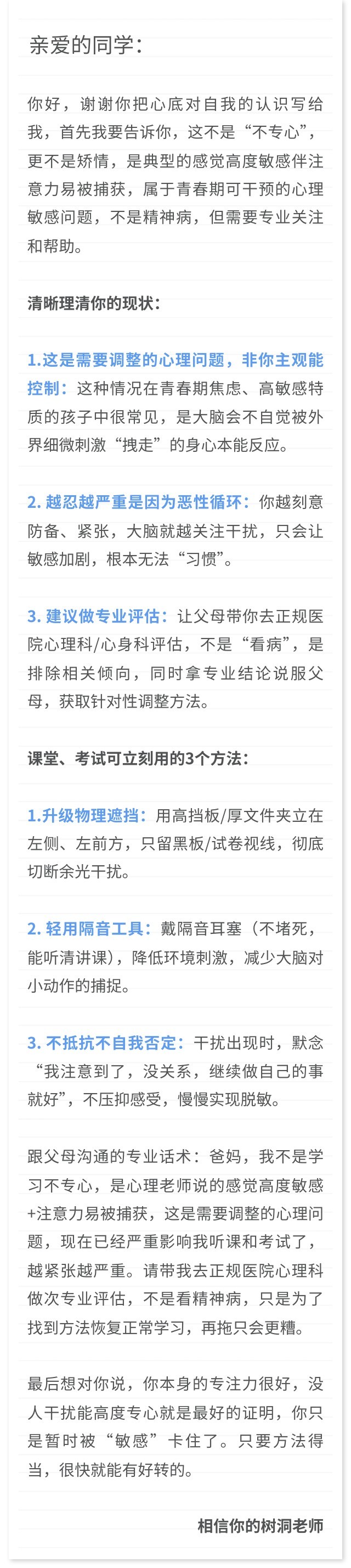 一位16岁高中女生:从九年级开始,我对周围人的小动作特别敏感,现在高一越来越严重。具体表现是:上课时,只要余光里有人抖腿、撩头发,哪怕是在我侧面很远的地方,我都会立刻被拽走注意力,完全听不进去课。考试时更严重,前后左右五排之内只要有大幅度抖腿,我就没法专心做题。干扰来的时候我会非常烦躁,尤其是重要的课或者考试,急得快哭了。干扰停止后我能恢复,但一旦重新开始,又被拉回去。从九年级到现在越来越重,按理说应该习惯才对,但没有。我已经严重到害怕考试、害怕某些课。