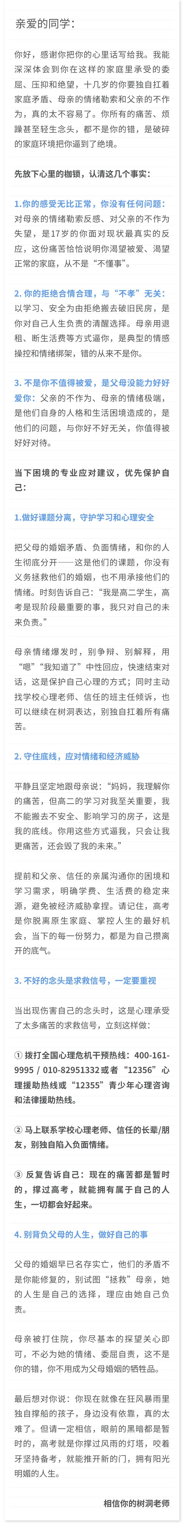 一位17岁高中女生:我爸妈从小关系很不好,主要围绕我爸懒惰不做事导致家庭经济贫穷且经济压力都在我妈身上。然后他们天天吵架,自我记事以来,如今发展到两看相厌的地步一年说不到两句话。然后我妈是个情绪不稳定的人,在外面受的委屈没地方发泄或者生我爸气也没地发泄就会转移到我身上,导致我自卑敏感,也很讨厌我母亲,也讨厌父亲的不负责任。我在学校不能好好学习因为我心情被弄得很糟糕,加上经济压力和学习压力,我感觉我要崩溃了好难受。