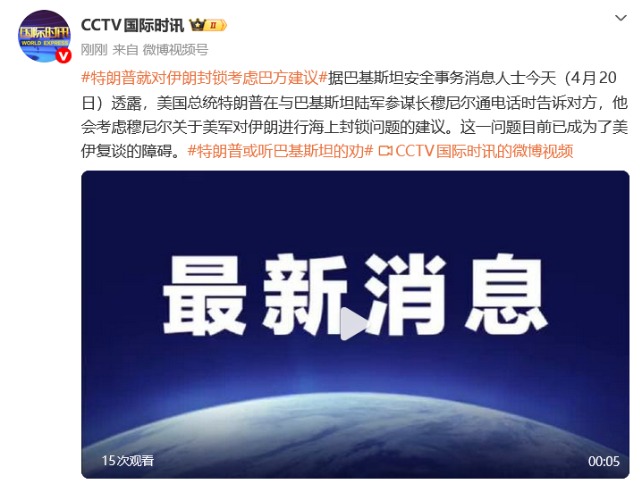 据巴基斯坦安全事务消息人士今天(4月20日)透露,美国总统特朗普在与巴基斯坦陆军参谋长穆尼尔通电话时告诉对方,他会考虑穆尼尔关于美军对伊朗进行海上封锁问题的建议。这一问题目前已成为了美伊复谈的障碍。
